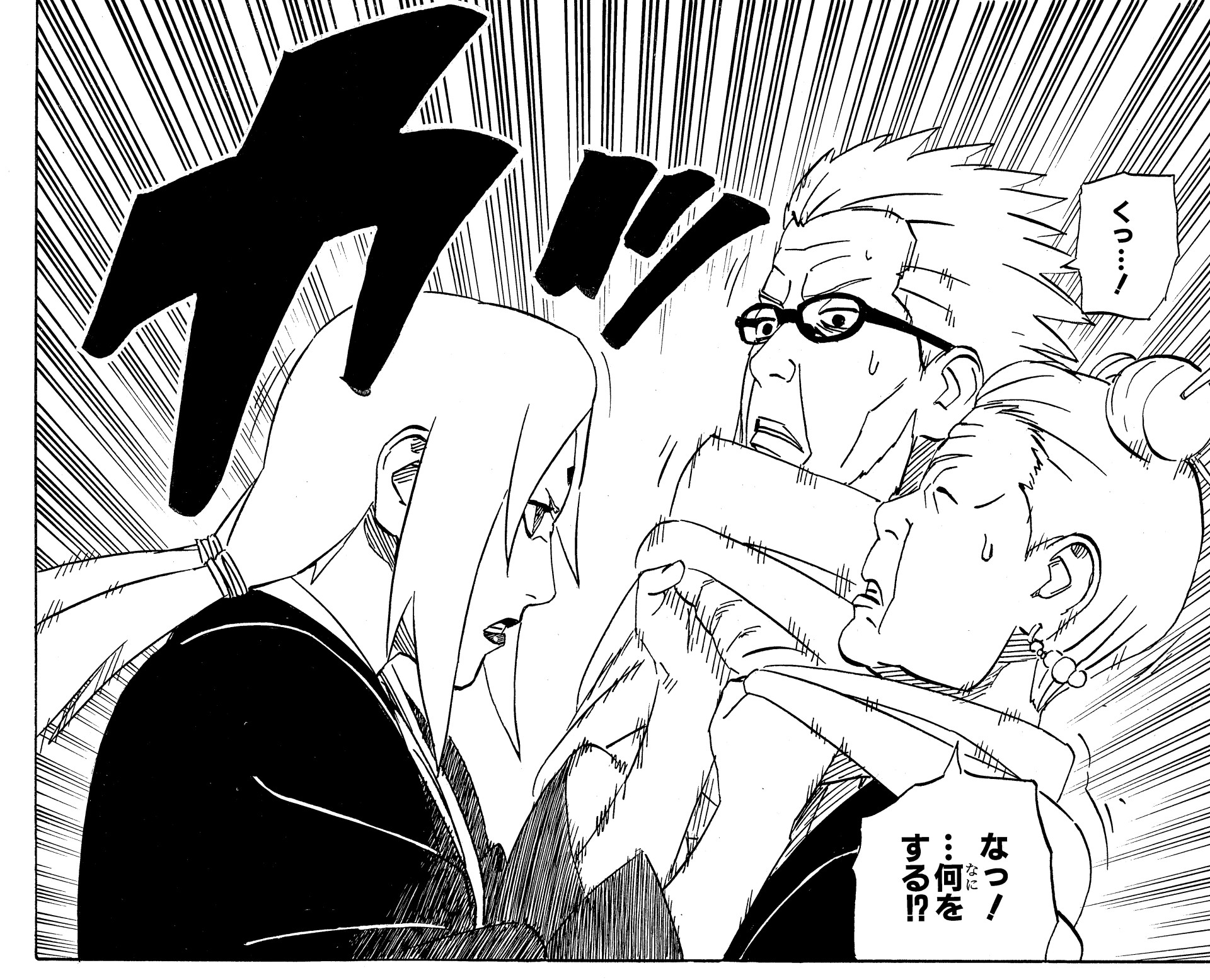 Alors que Jiraya continuait d'essayer de la persuader, Naruto était furieux de l'attitude de Tsunade qui se moquait du titre de Hokage !
