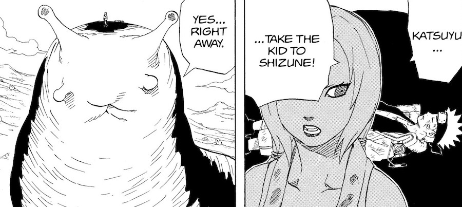 Yamashita: En effet. « Katsuyu » s'écrit avec le kanji de la limace. Dans le gôkan, Tsunade brandit son épée « Katsuyumaru » pendant l’affrontement entre Jiraiya et Orochimaru, et chevauche également une énorme limace pour s’enfuir. C'est une femme très puissante au cœur pur.