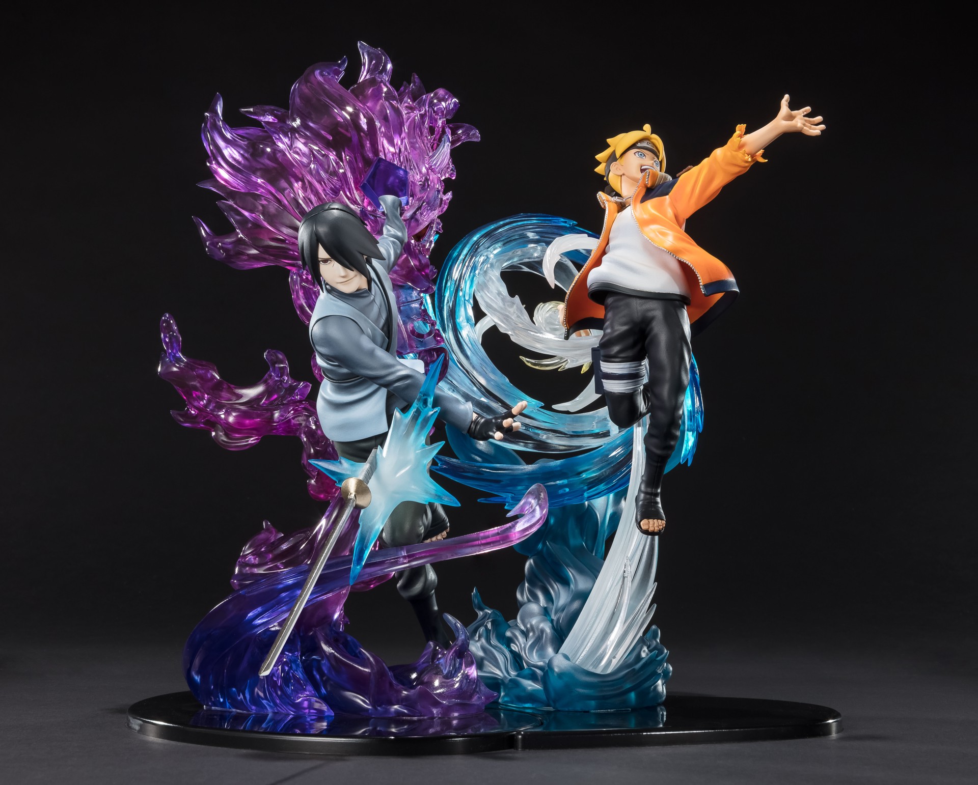 La posa dinamica di Sasuke lo mostra mentre lancia la sua spada mentre attiva Susano'o!