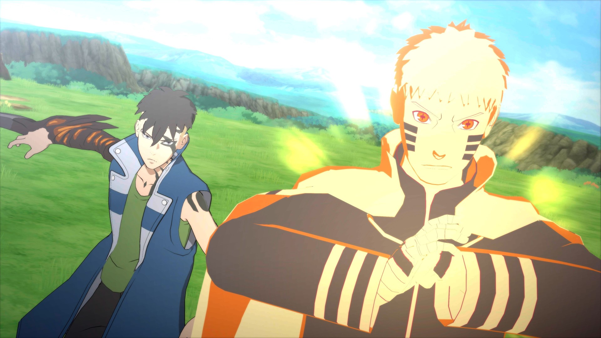 Naruto in Kurama Link Mode lancia l'avversario in aria e lavora con Kawaki per sferrare un attacco a tenaglia!
