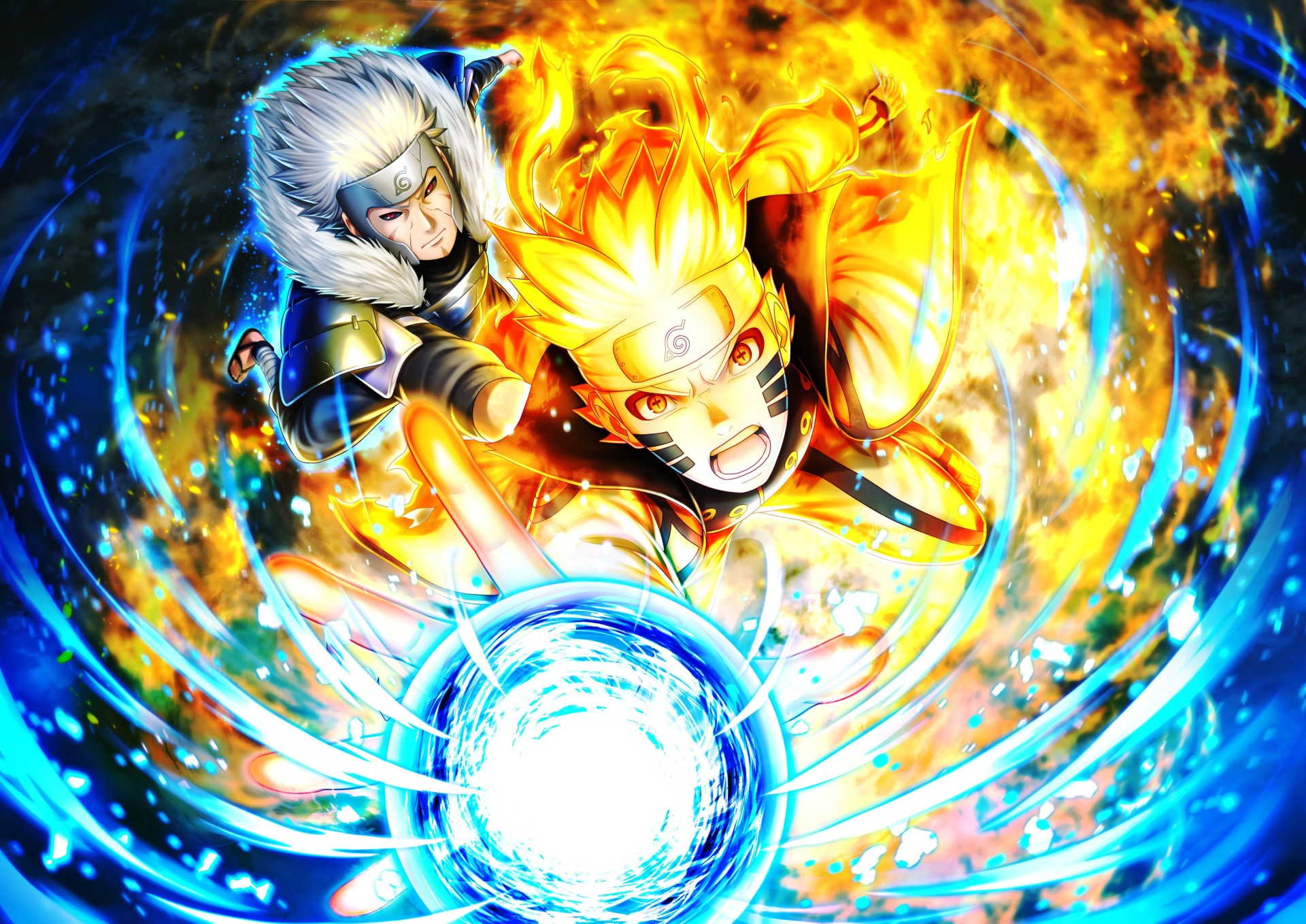 Dopo essere stato trasportato dal Flying Raijin Jutsu di Tobirama, colpisce con il Rasengan da mezz'aria per infliggere danni enormi!