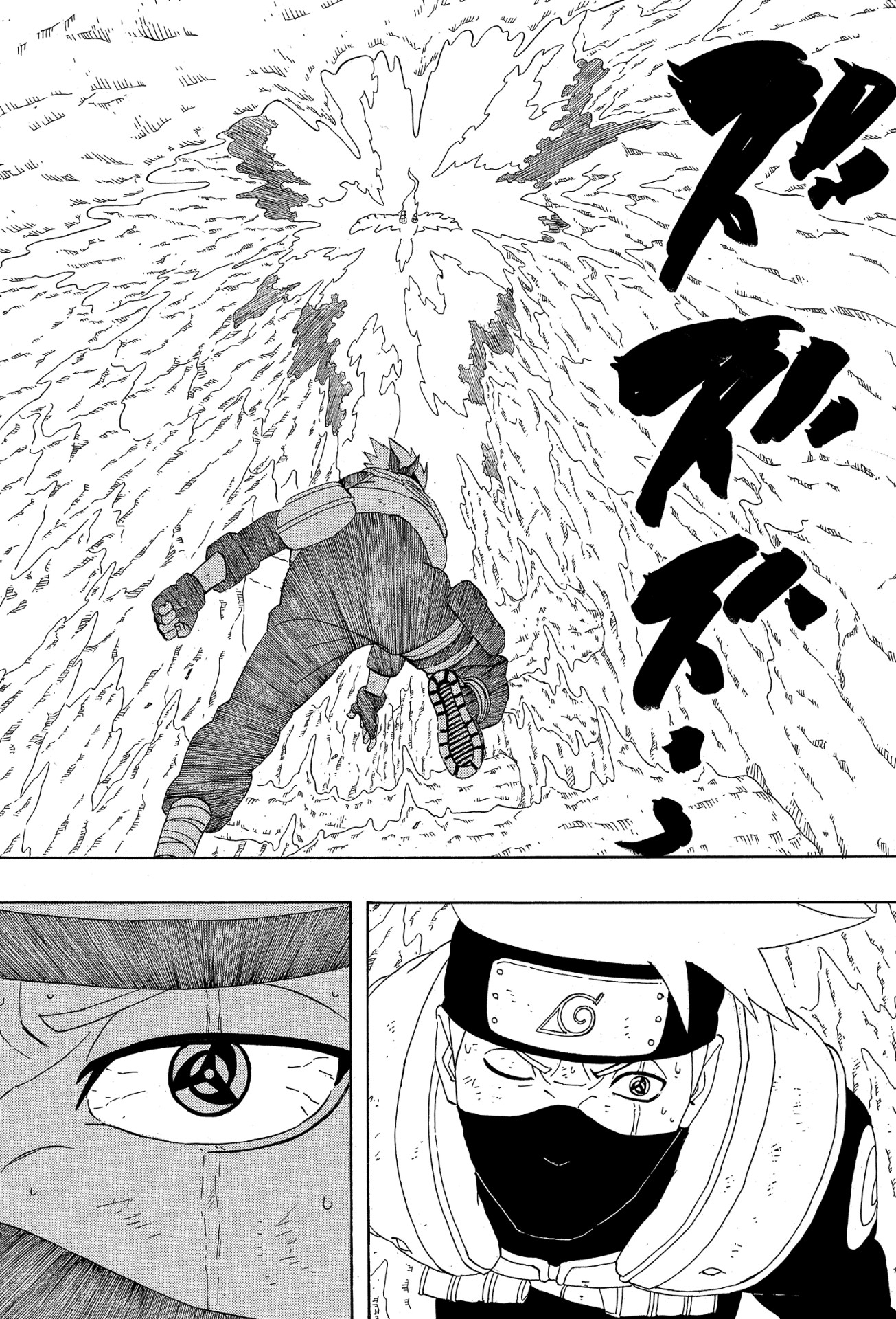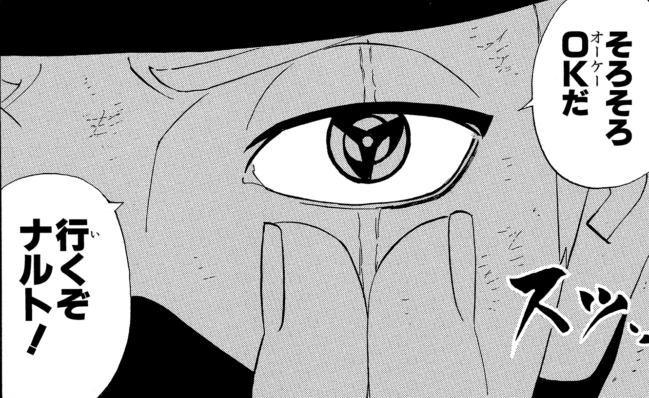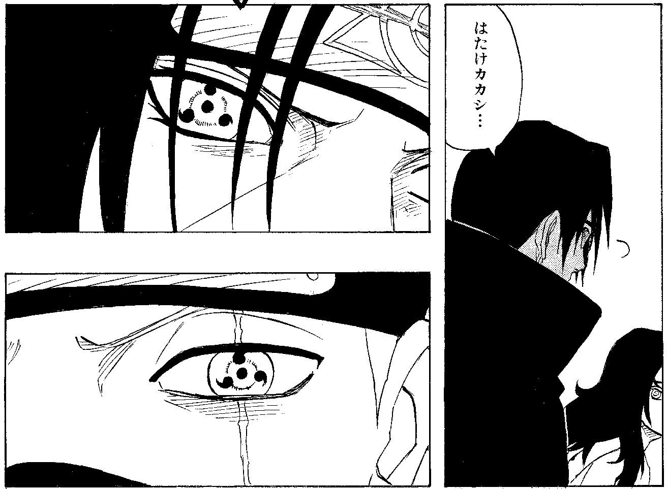Di fronte a questa pericolosa situazione, Kakashi attiva il suo Sharingan e sfoggia tutta la sua forza.