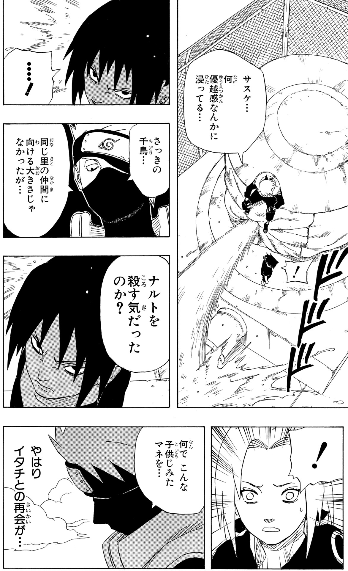 Il ragazzo raggiunge e combatte Itachi, ma si accorge presto dell'abissale differenza che c'è tra loro. Anche se non completamente guarito dalle sue ferite, Sasuke decide di sfidare poi Naruto ad un combattimento per sfogare la sua rabbia.