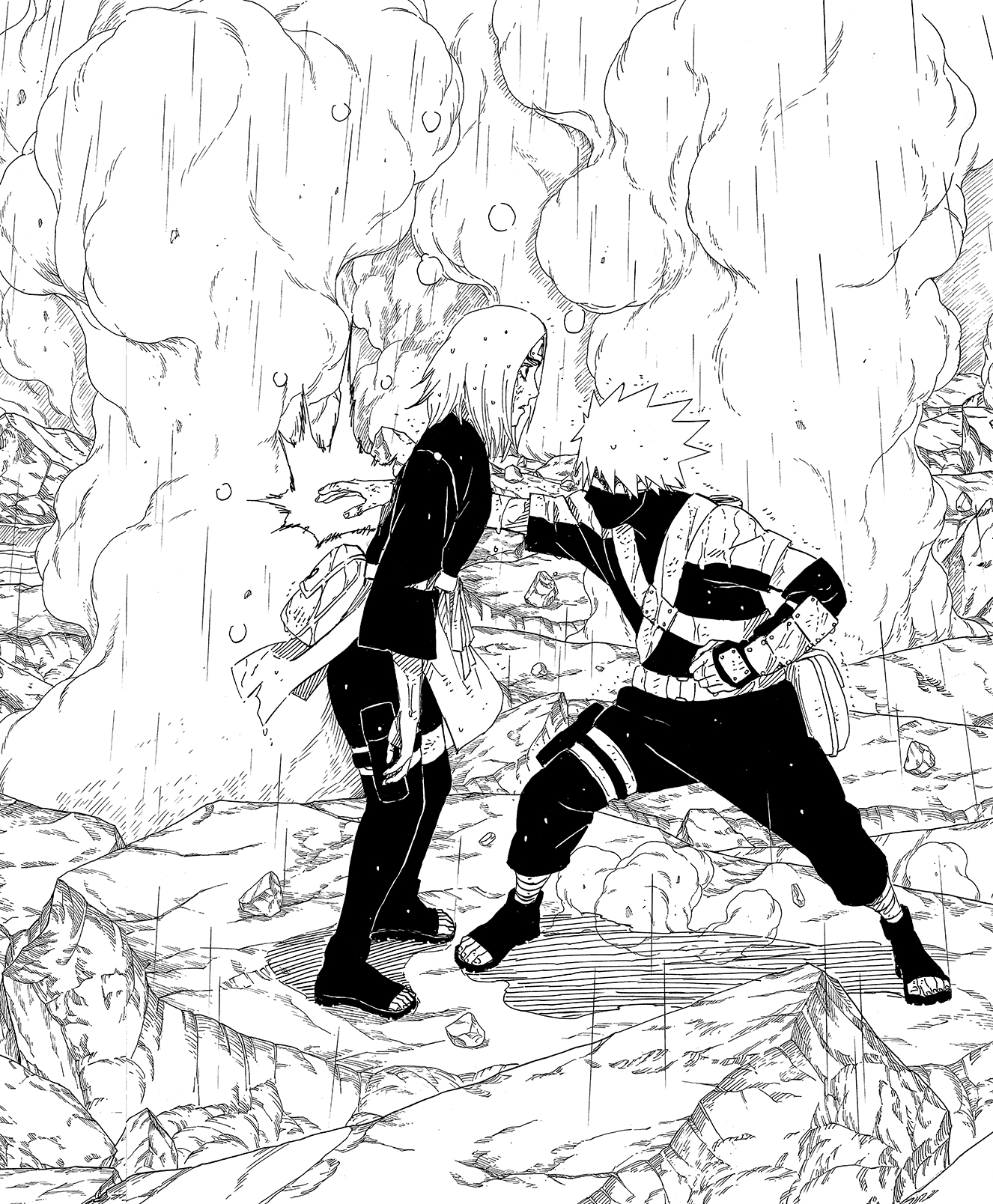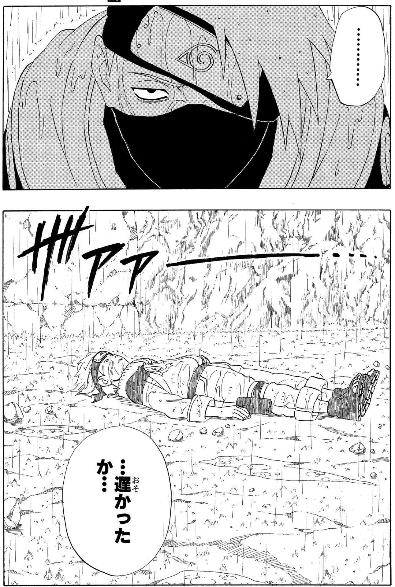 Kakashi, una volta scoperta la situazione, si precipita dai due. Ma ormai è troppo tardi.