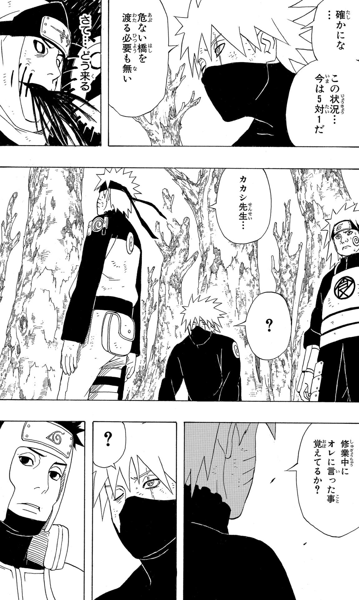 Kakashi sa bene che Zabuza è sopravvissuto, perciò decide di preparare i suoi allievi allo scontro incombente con un allenamento alquanto particolare: arrampicarsi sugli alberi.