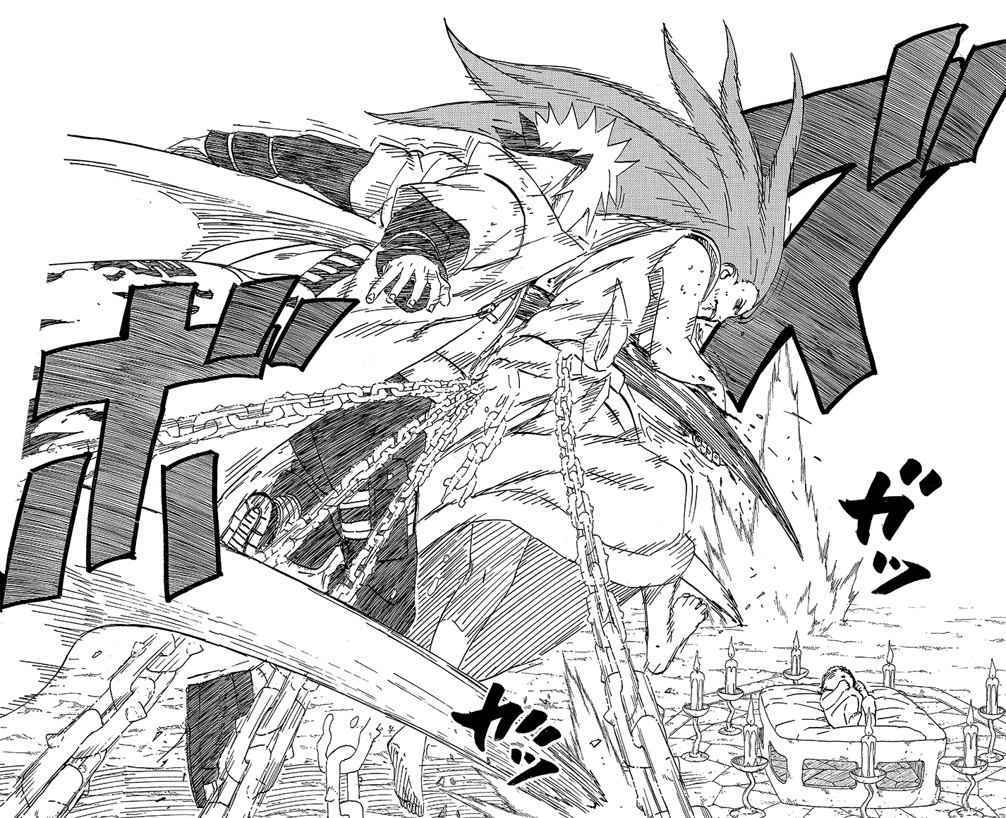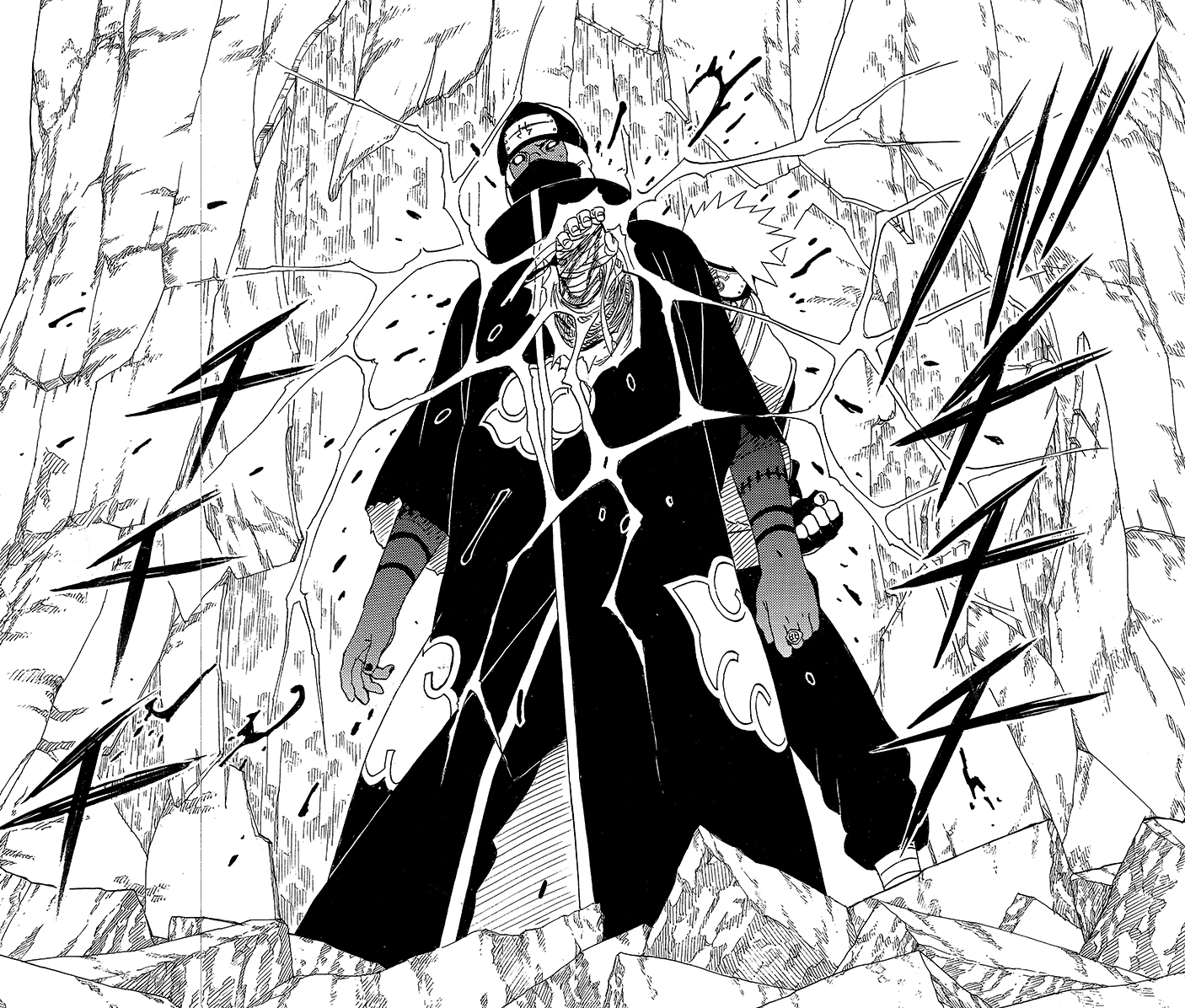 Proprio quando la nuova tecnica di Naruto viene perfezionata, Kakashi si ritrova nello scontro con Hidan e Kakuzu, i due immortali di Alba.