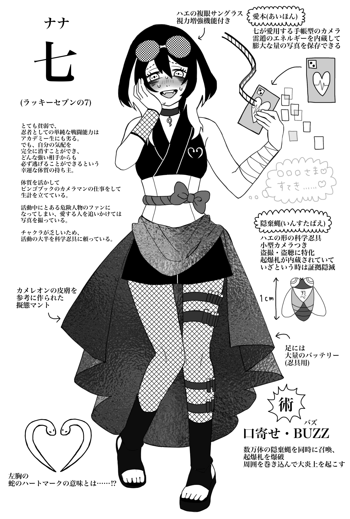 È una shinobi eccezionalmente debole che non sarebbe in grado di reggere il confronto in battaglia contro uno studente dell'accademia. La sua grazia salvifica è che possiede la capacità di sopprimere completamente la sua presenza, dandole la libertà di scappare anche dai nemici più forti. Sfruttando la sua abilità, si guadagna da vivere scattando foto di ninja ribelli e criminali con taglie sulla testa. Sembra essere una fan di una certa persona che potremmo conoscere...