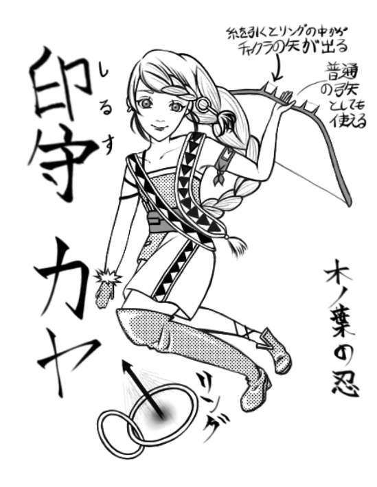 Quindi è un'arciera, ma è in grado di scoccare frecce dall'anello che galleggia appena sopra il suo arco, il che significa che il suo ninjutsu segretamente ha una sorta di aspetto di tecnica di trasporto, eh? Se caricasse le frecce con oggetti diversi, forse potrebbe usare questa tecnica anche per le consegne. Il suo lavoro principale sembra essere quello di designer, ma mi chiedo come il suo settore sfrutti questa capacità.