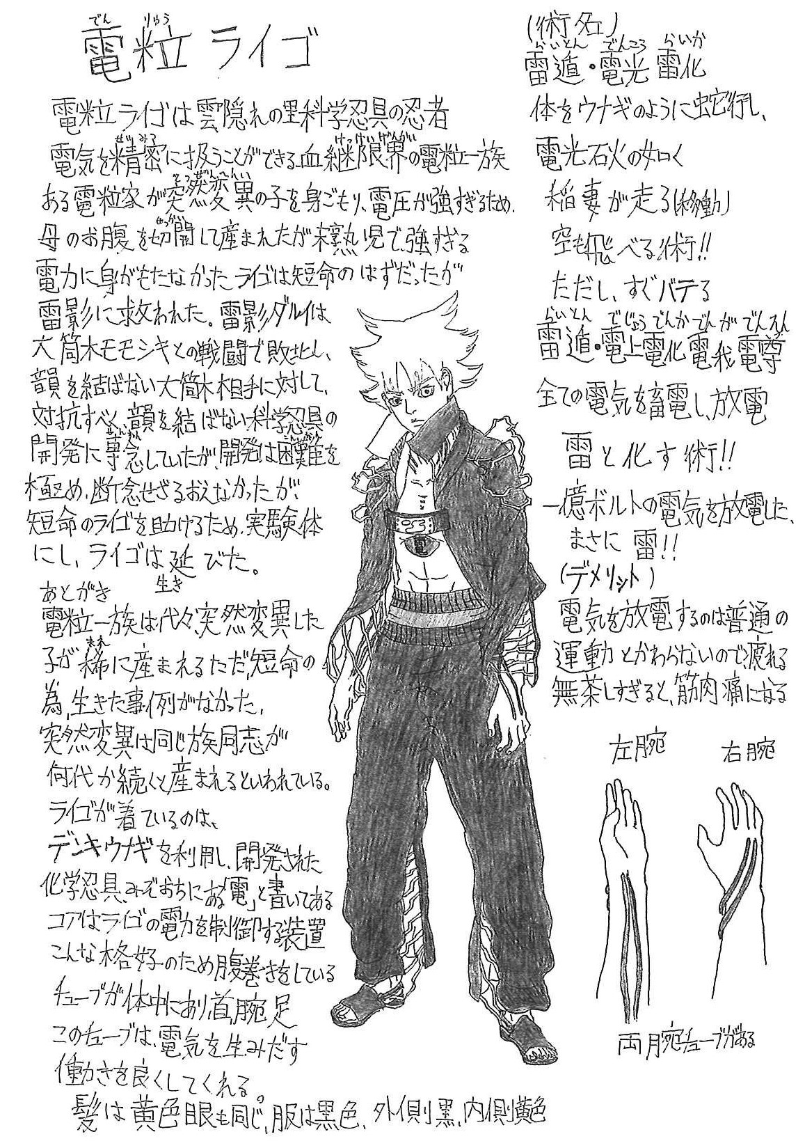 Un utilizzatore di strumenti ninja scientifici proveniente dal Villaggio Nascosto nella Nuvola e membro del clan Denryu che possiede una Kekkei Genkai che gli consente di controllare l'elettricità con precisione. È nato con una mutazione ed è stato salvato dal Raikage.
