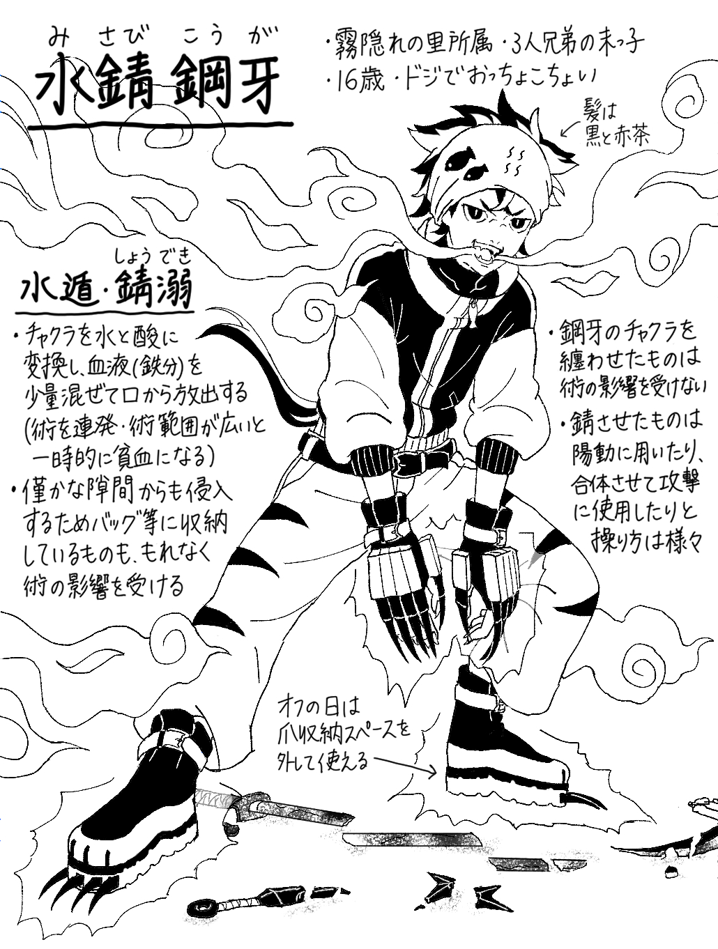 In realtà abbiamo ricevuto un sacco di candidature per shinobi del Villaggio Nascosto nella Nebbia che questa volta manipolano il sangue (e il ferro), ma questo è uscito vincitore grazie alle sue interessanti abilità e all'applicazione creativa dei suoi poteri. Mi piace particolarmente il modo in cui le armi artigliate e i disegni di pesci sulla sua bandana e sulla cerniera evocano naturalmente nell'osservatore l'immagine di un gatto.