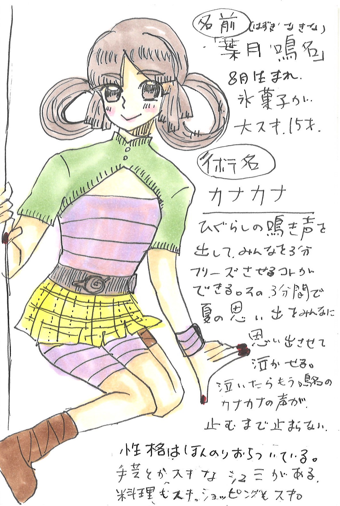 Imitando il cinguettio di una cicala, riesce a far congelare tutti per tre minuti. Durante questi tre minuti, tutti vengono portati alle lacrime dai ricordi dell'estate. Una volta che iniziano a piangere, non saranno in grado di fermarsi finché il cinguettio di Nakina non si fermerà.