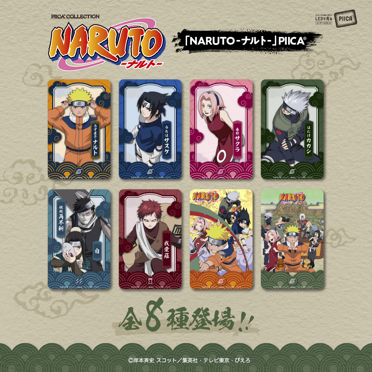 ナルト、サスケ、サクラ、カカシ、そして第七班3人のカラーに「鈴取り」のモチーフがあしらわれたデザインの計5種類がラインナップ!