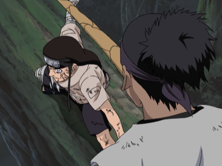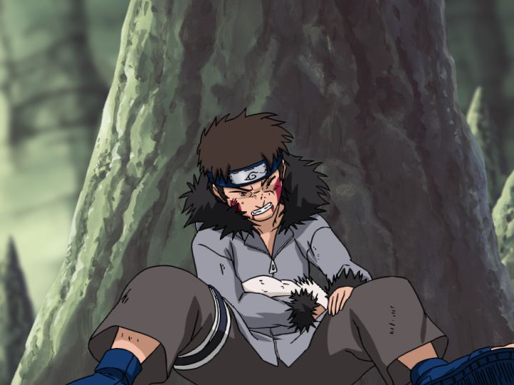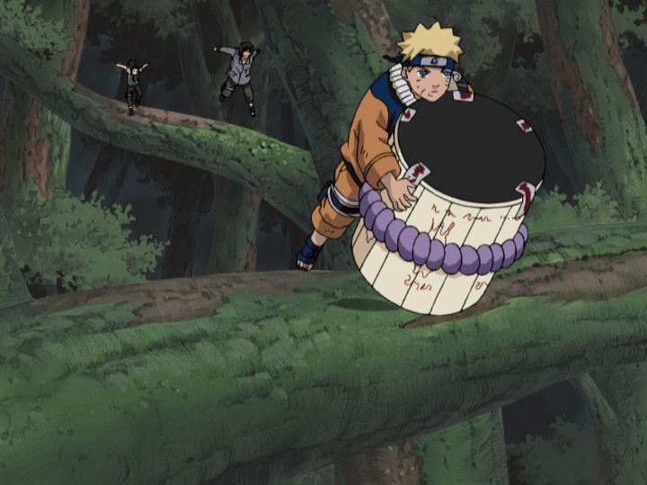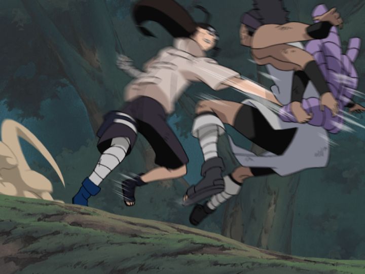 崖下に落下したキバ&赤丸は左近と、多由也はシカマルが請け負い、ナルトは君麻呂と対峙します。