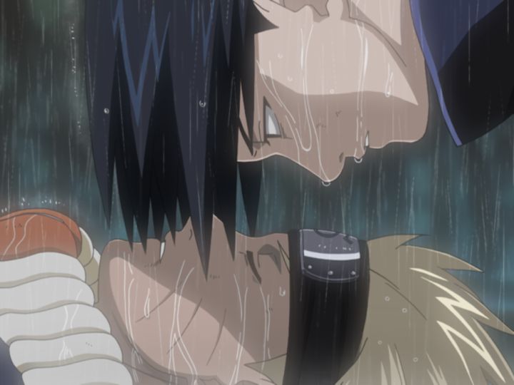2人に涙雨が降り注ぎ、サスケは傷ついた体を引きずりながら、