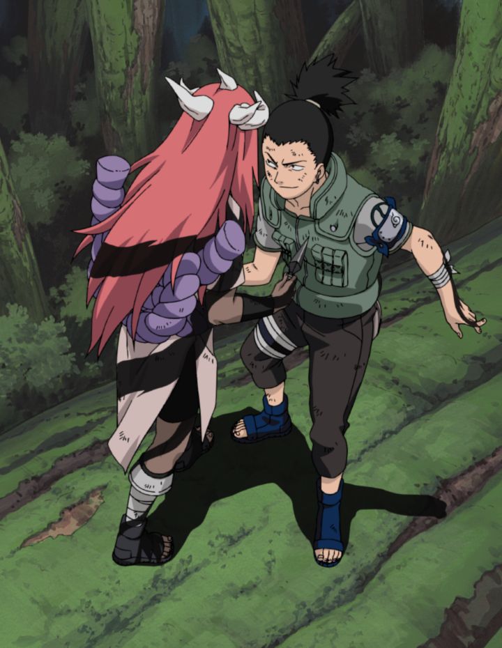 一方、シカマルは多由也が笛の音で操る三体の怪物を相手に苦戦。