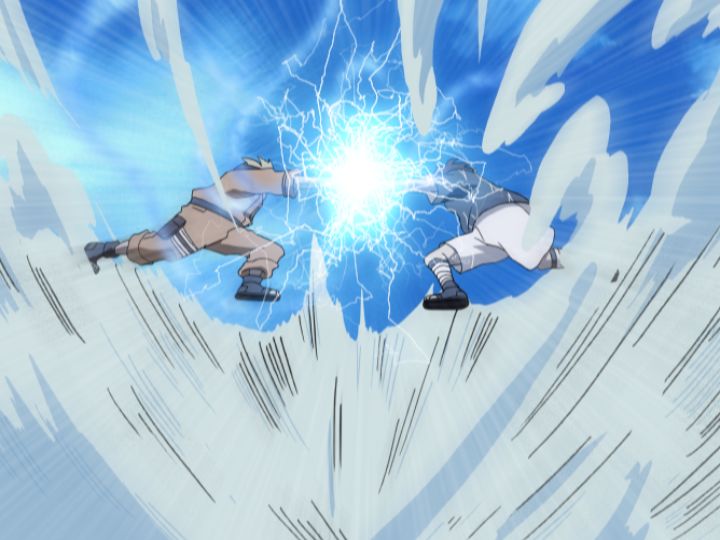 屋上での決戦ではカカシが仲裁に入りましたが、今度はナルトの螺旋丸とサスケの千鳥が真っ向からぶつかり合います。