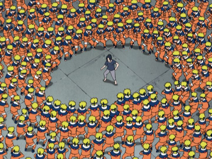 ナルトの影分身にサスケは豪火球で対抗し、