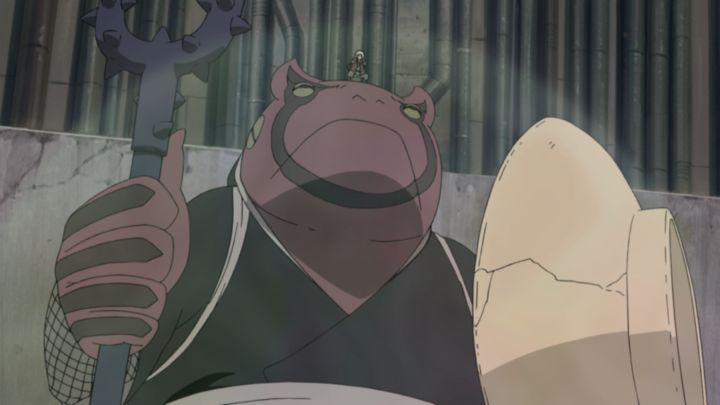 巨大な口寄せ動物を呼び寄せ戦いを仕掛けてくるペインに対向し、自来也も巨大蝦蟇・ガマケンを口寄せして対抗!