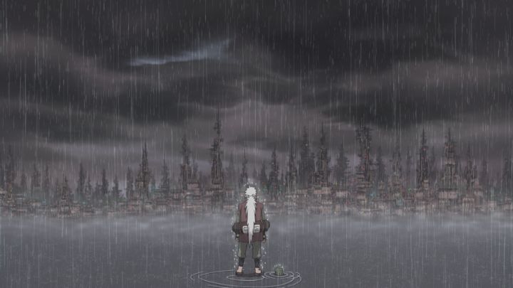 “暁”のリーダーに関する情報を掴んだ自来也は情報収集のため、雨隠れの里に潜入。