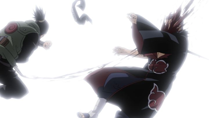 カカシが雷切で角都の心臓を貫きます!