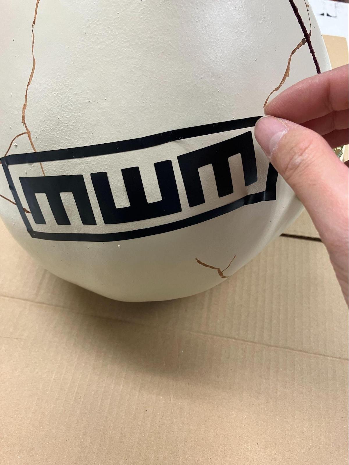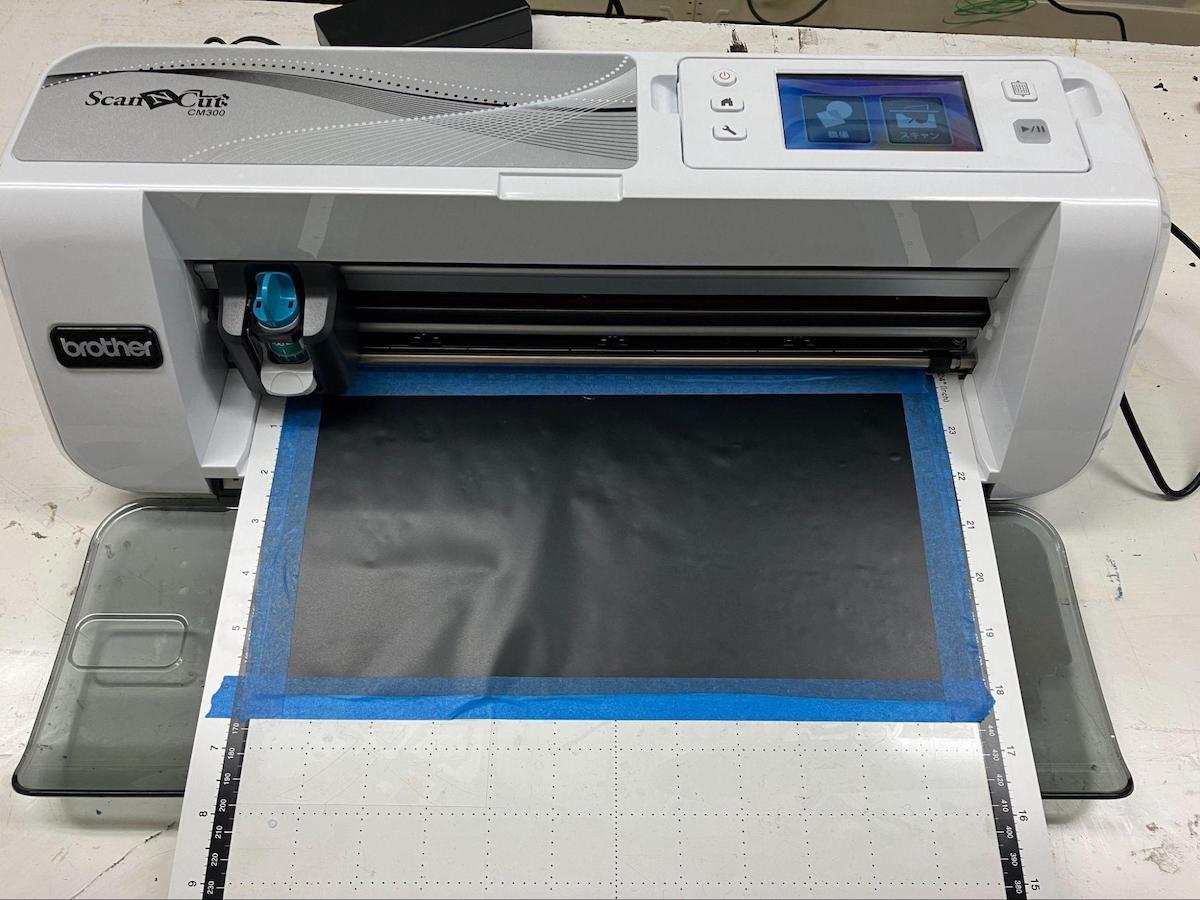 次は外側を装飾していきます。カッティングプロッター(編注:文字やイラストのデータを読み込んで、その通りにシートをカットする機械)であの特徴的なマークをカットして……。