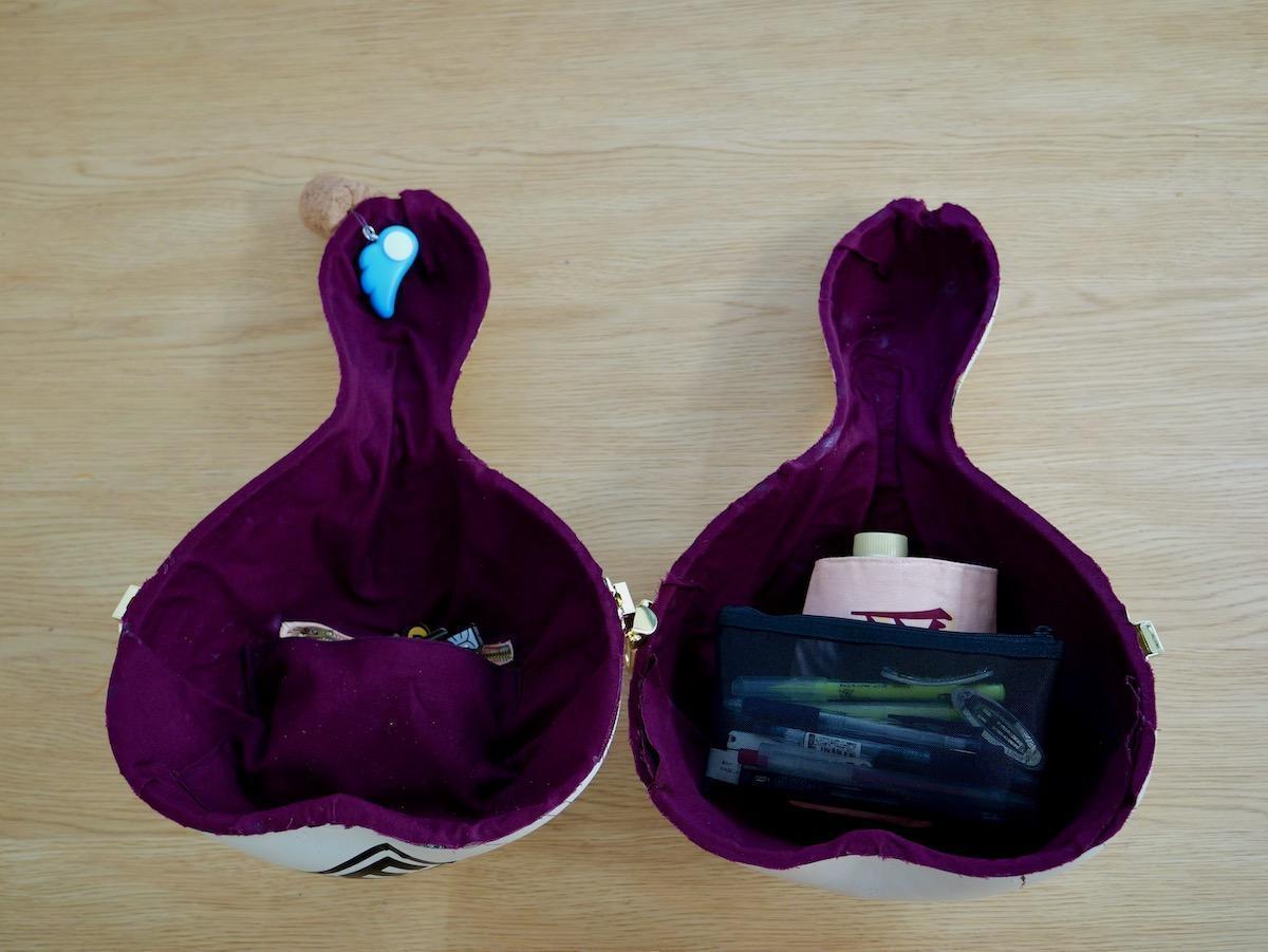 アタッシュケースのようにパカッと開くようになっており、中にはペットボトル入れ(写真右)、ポーチ(写真左)などの機能がついております。