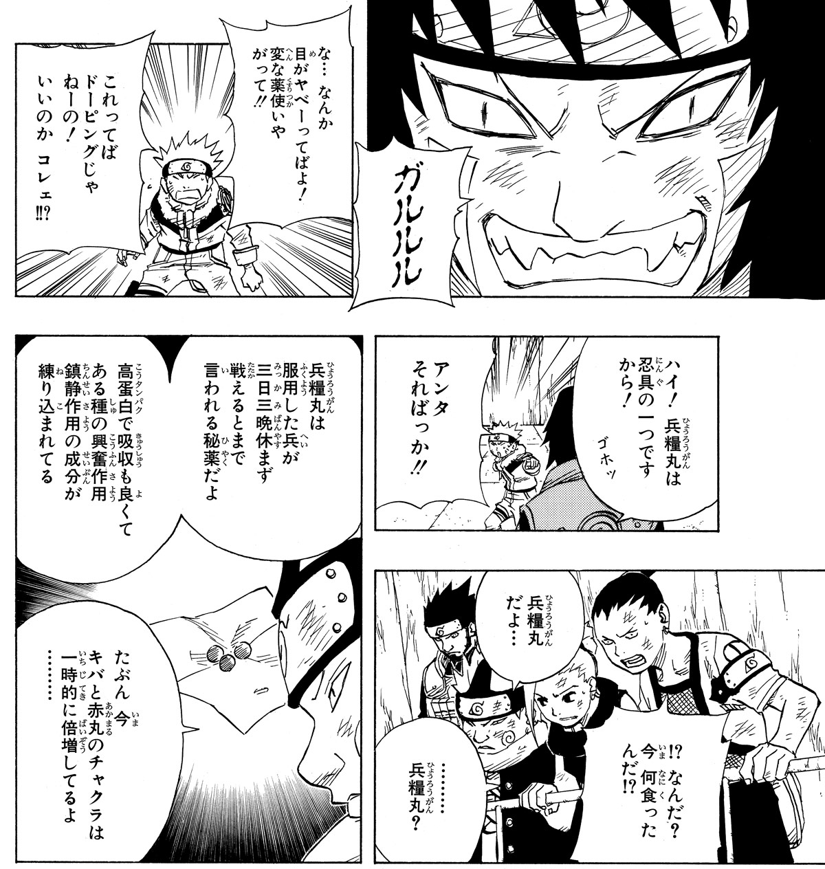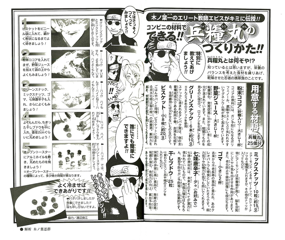 そういうわけで「兵糧丸(ひょうろうがん)」です。昔の日本で忍者が食べていた携帯食なんですが、『NARUTO-ナルト-』における兵糧丸は主にチャクラの回復や増強、ついでに精神状態が向上したり不眠不休で戦闘できたりと、よりマジカルです。