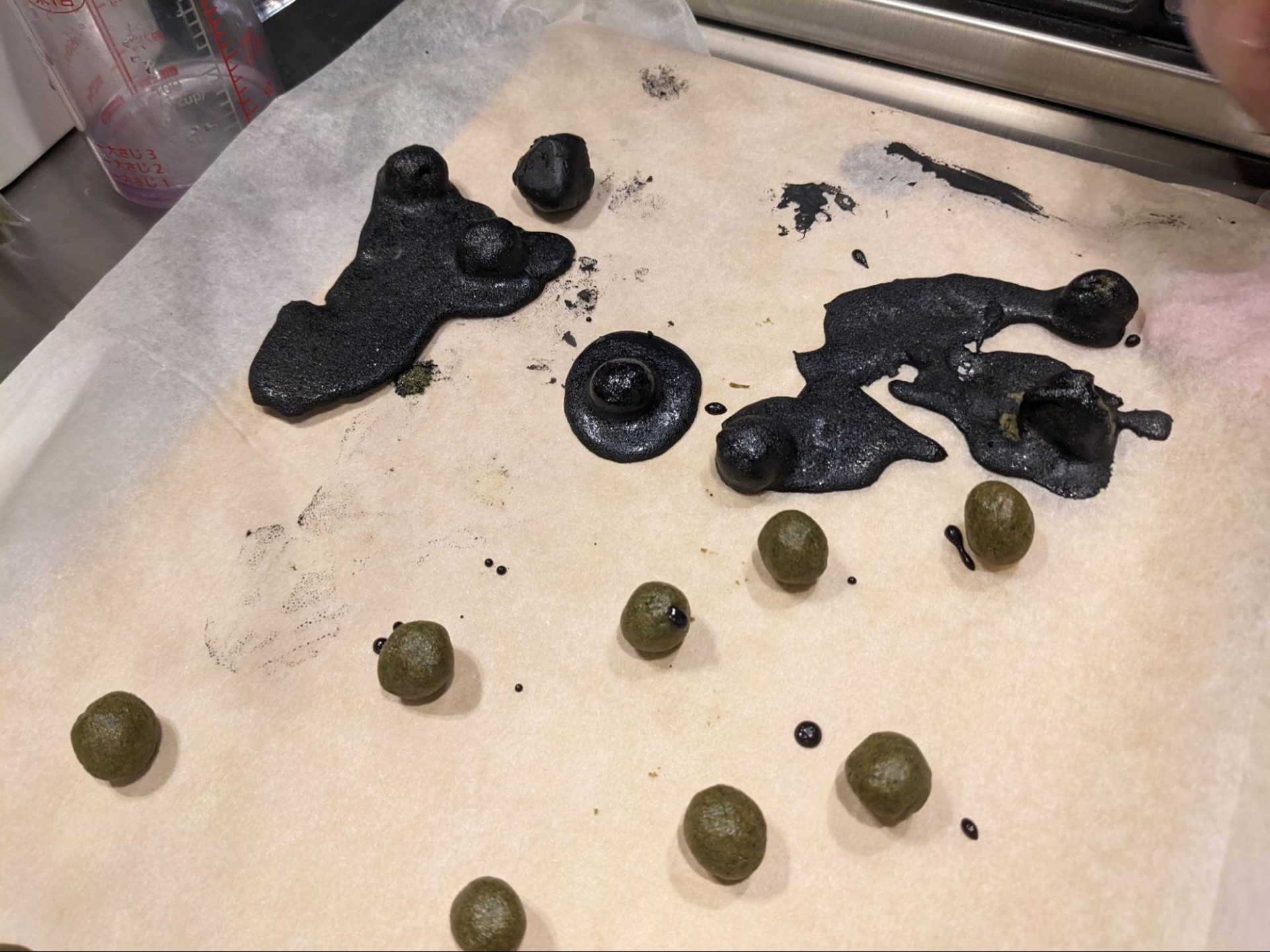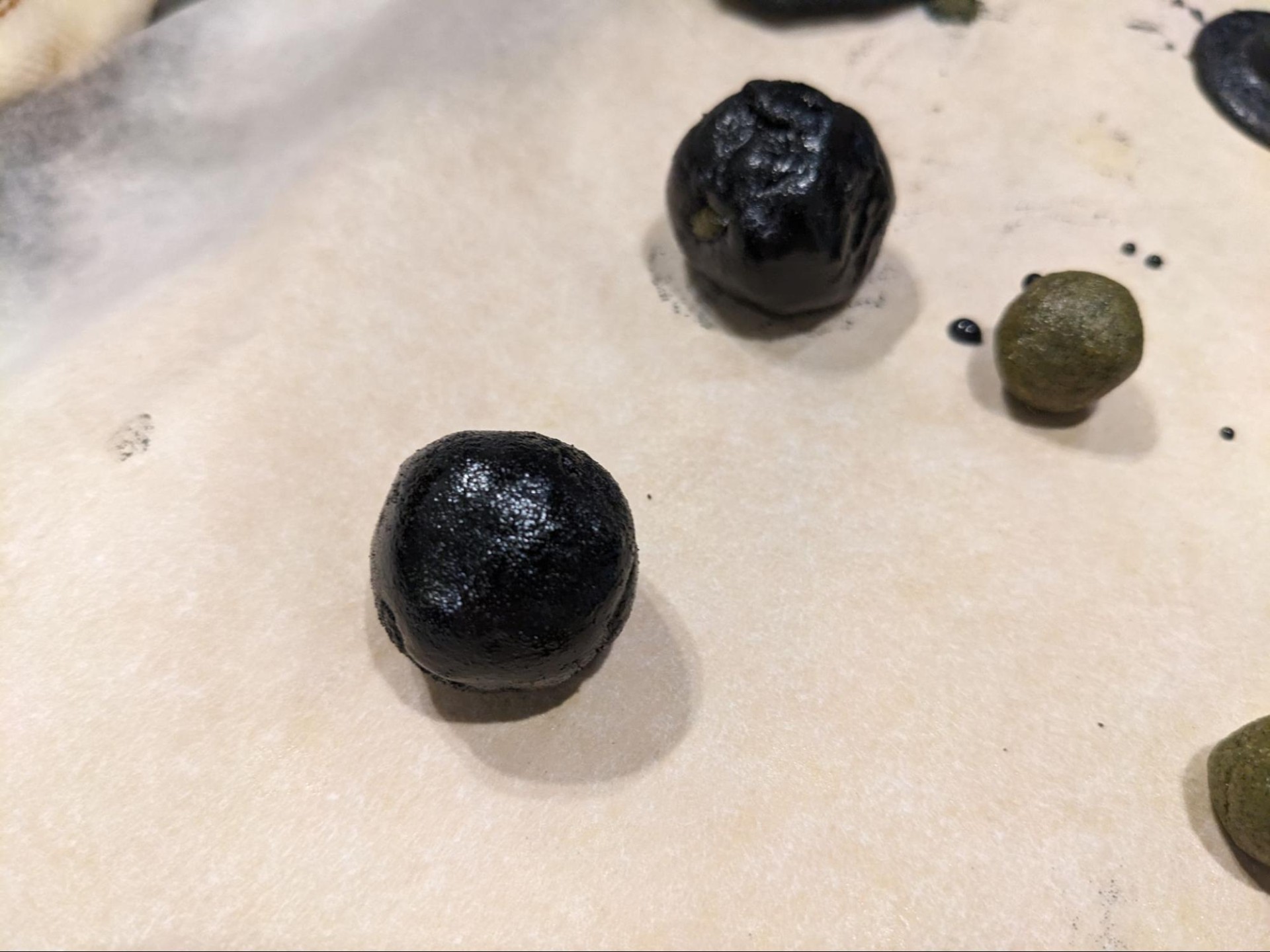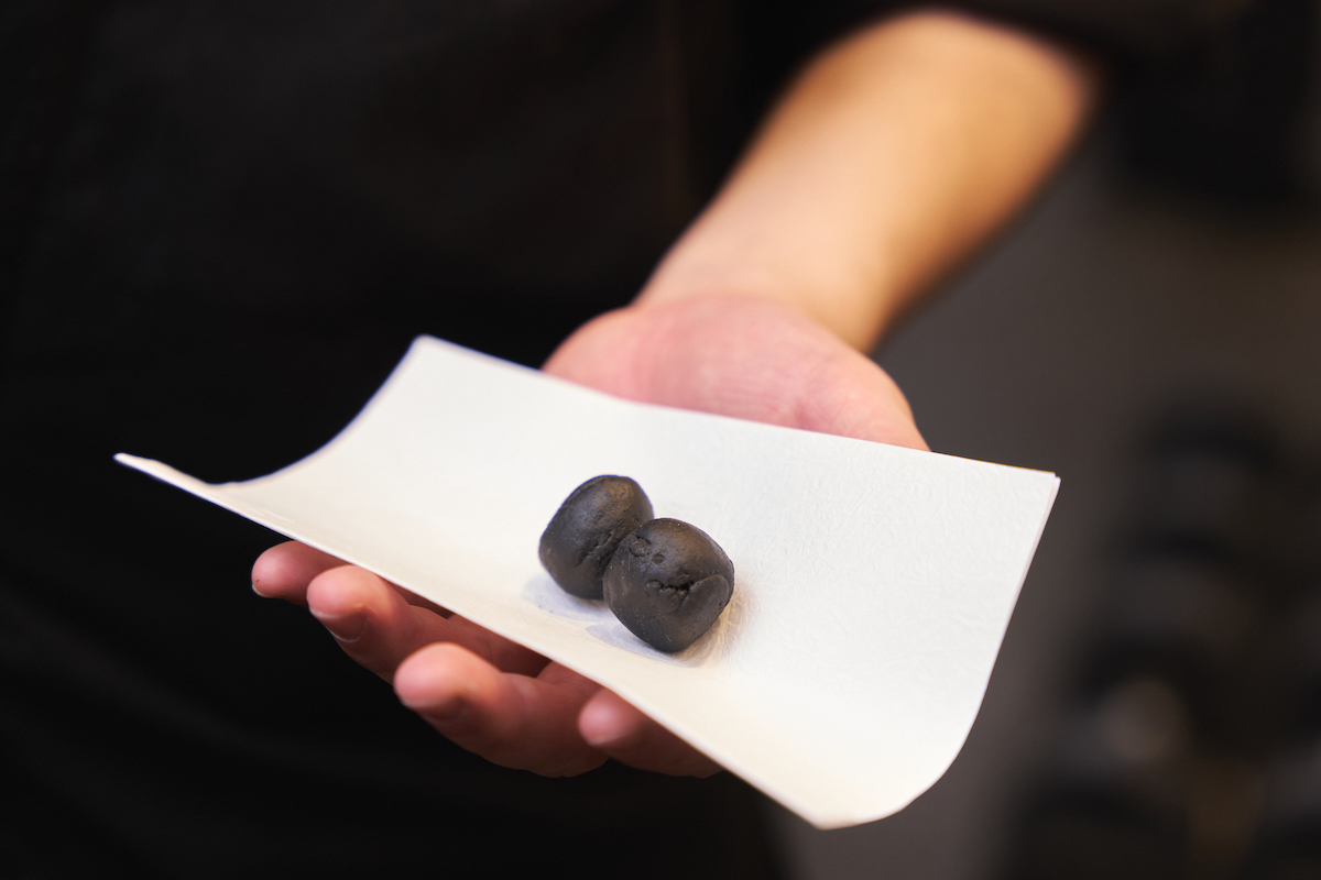 これを踏まえて、より兵糧丸ぽくなるよう黒色の食用色素を使って黒いすり蜜を作ってみた訳ですが、冷えたすり蜜は鬼のような硬さをもつため大変な目に遭いました。皆さんは加熱前から色素を入れるべきです。