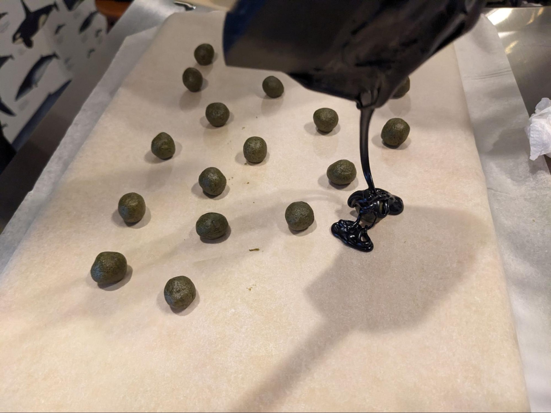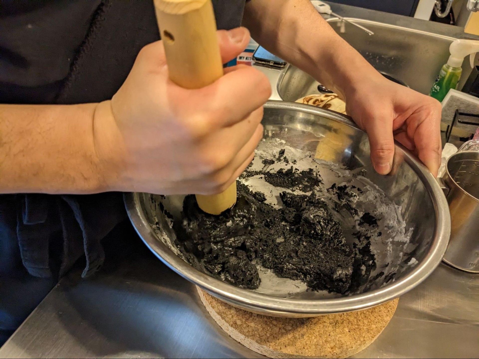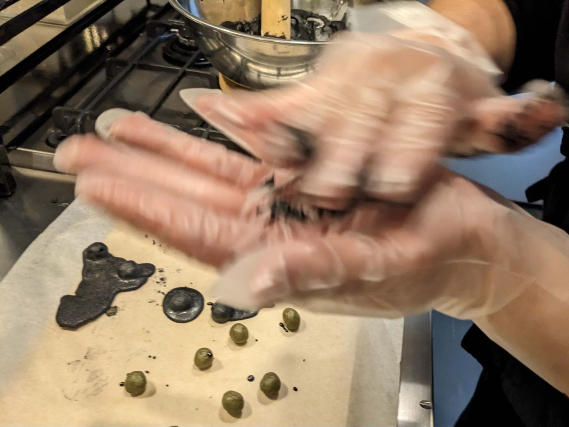 これを踏まえて、より兵糧丸ぽくなるよう黒色の食用色素を使って黒いすり蜜を作ってみた訳ですが、冷えたすり蜜は鬼のような硬さをもつため大変な目に遭いました。皆さんは加熱前から色素を入れるべきです。