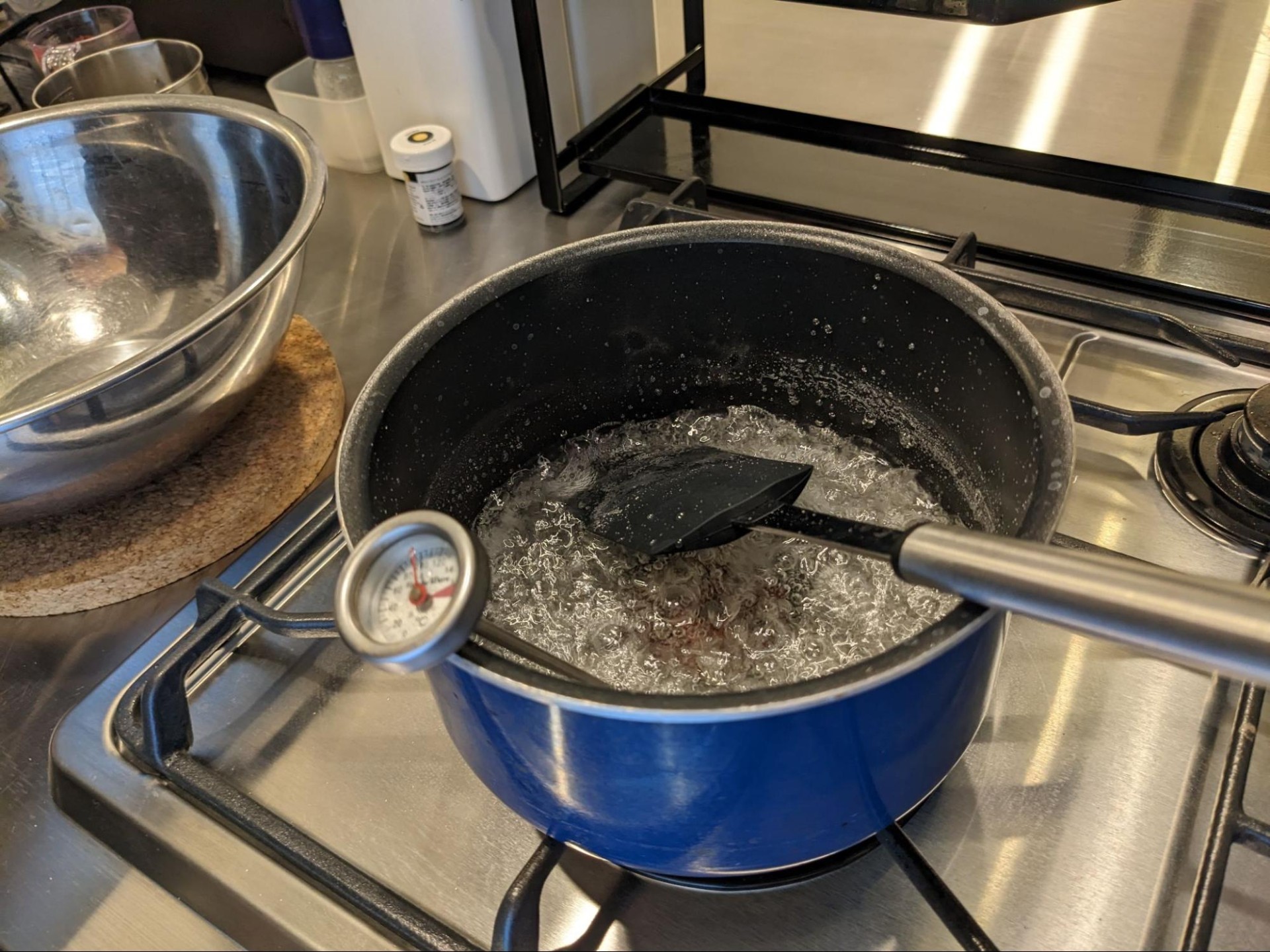「すり蜜」という砂糖を使った和菓子のコーティング技法があるので応用してみました。砂糖と水を混ぜて110℃~115℃に加熱します。