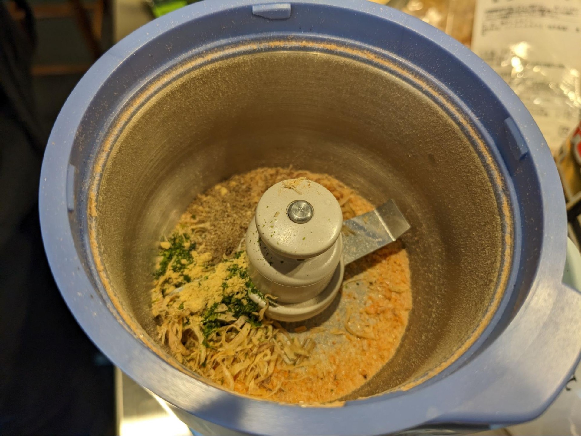 ではまず全体をまとめて粉にしてみましょう。電動ミルでは切りイカが粉砕できなかったのでハサミで細かくします。