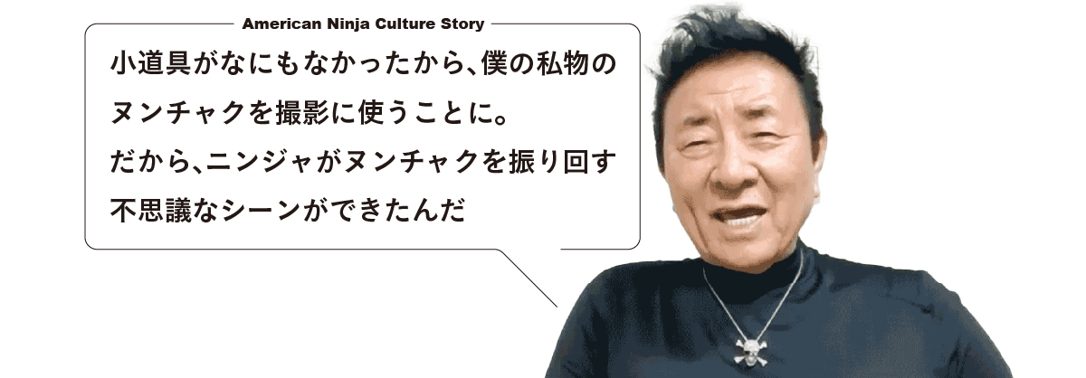 ネロさんだけでなく、ニンジャのことをあまり理解していなかったのは『燃えよニンジャ』のスタッフたちも同じです。僕はスタッフがニンジャの武器を小道具として用意しているものだと思っていたんですけど、聞いてみたら、「フィリピンで手に入るだろ」と言っていて、何も用意されてなかったんですよ(笑)。もちろん、1980年代初頭のフィリピンでニンジャの武器なんか手に入るはずがありません。それで、仕方なく僕が自分の訓練用に持ってきていたヌンチャクやトンファーを撮影で使うことになったんです。