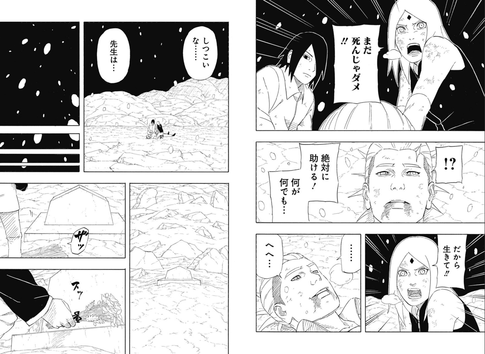 その修正後のネームを担当編集さん経由で岸本先生にお見せしたら、岸本先生がその最後の1ページ分のネームの修正案をわざわざ描いてくださって、それが最初に自分が描いた構図とほぼ同じで、サスケとサクラの後ろ姿だったんですね。