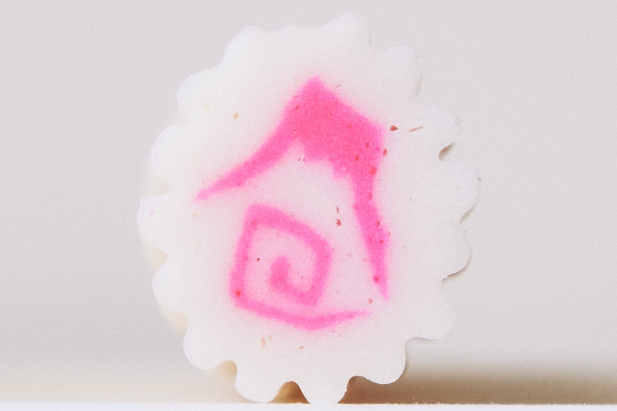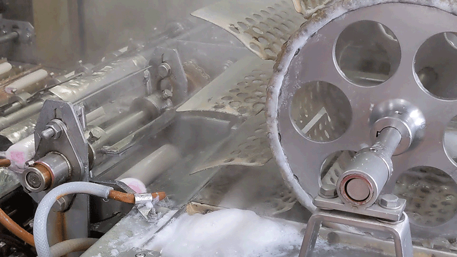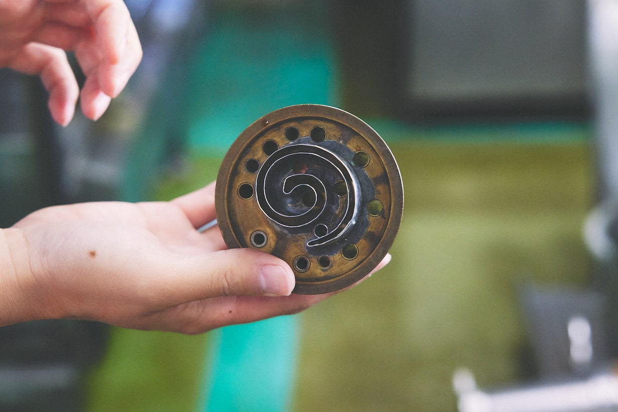 では、どのようにしてあの渦巻き模様をつけるのか、というと渦巻き模様の形に生地を絞り出している。