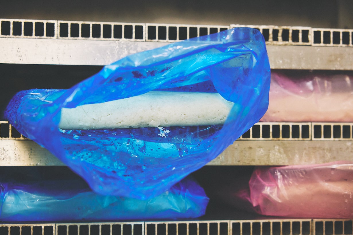 これがなるとの原材料となるすり身だ。スケトウダラやイトヨリダイなど三種類ほどの魚の身をブレンドする。一種類でも作れるけど、ブレンドすることで「力」が出る。力とは弾力や粘りのこと。この力を出すために、各社工夫をこらしているそうだ。