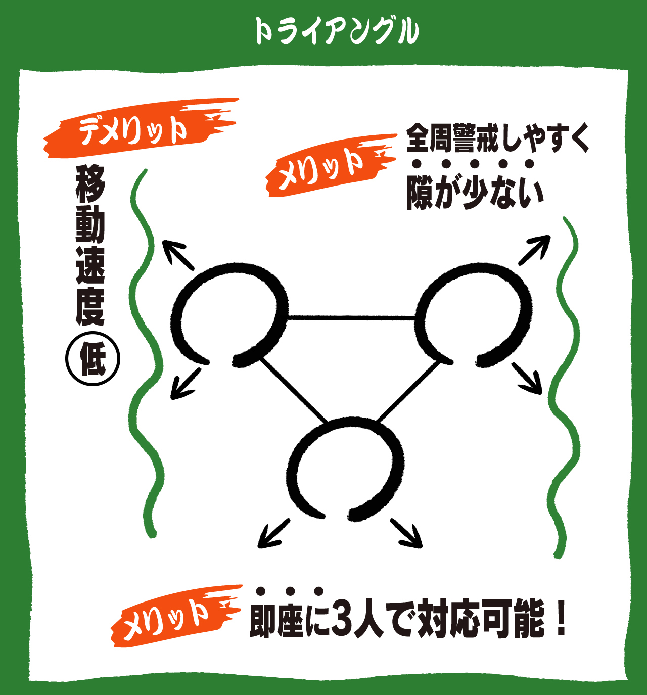 ちなみに目の前の状況によって、とるべきフォーメーションは変わります。チームのリーダーが状況に応じて判断し、臨機応変に適切なフォーメーションを組んでいくことが重要ですね。