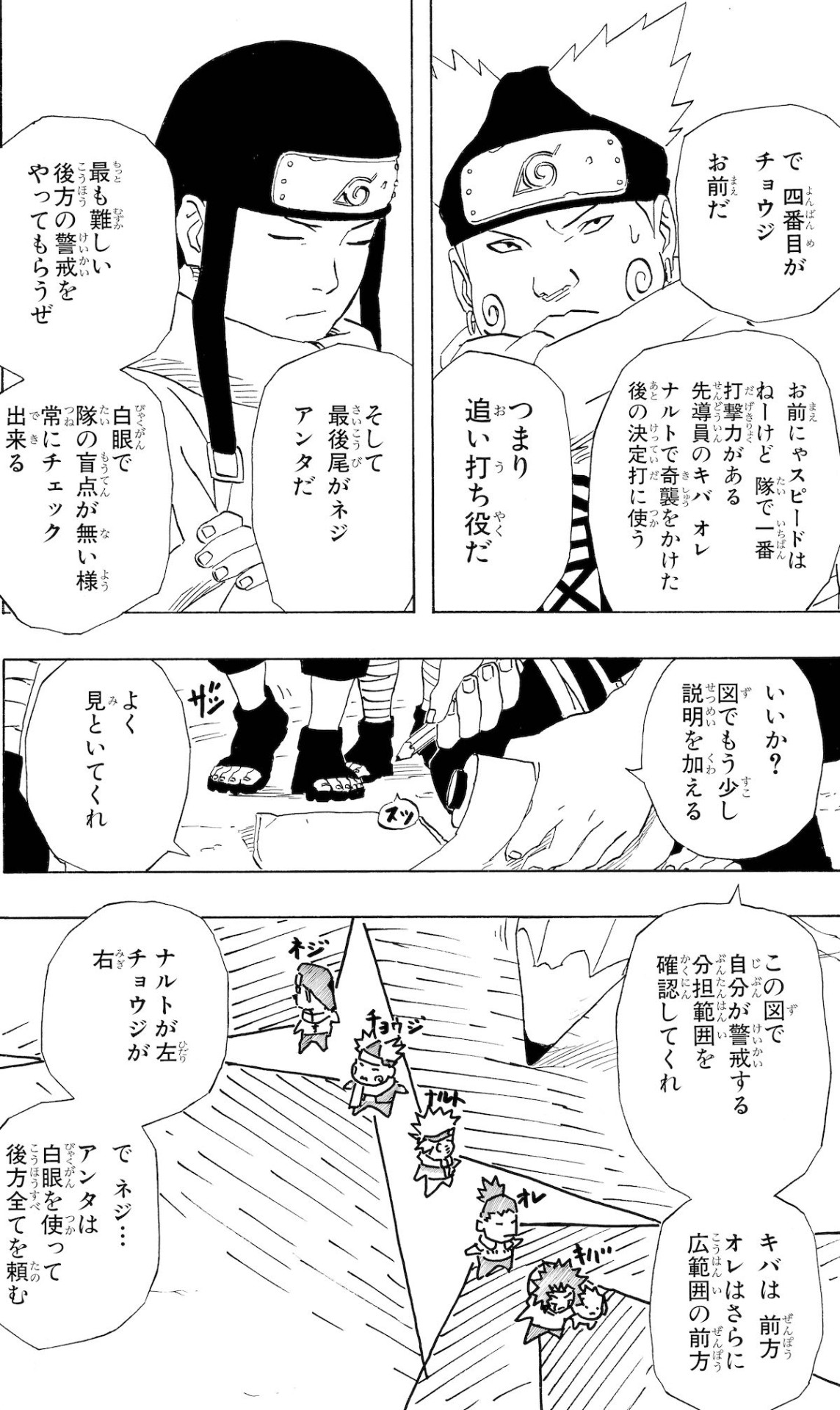 また、フォーメーションや戦術もその時々によって変わる。例えば、サスケ奪還任務でリーダーのシカマルが採用したのは「一列縦隊」。メンバーの適正や能力に合わせて縦隊の並び順を決めるなど、即座に最適な采配を振っていた。