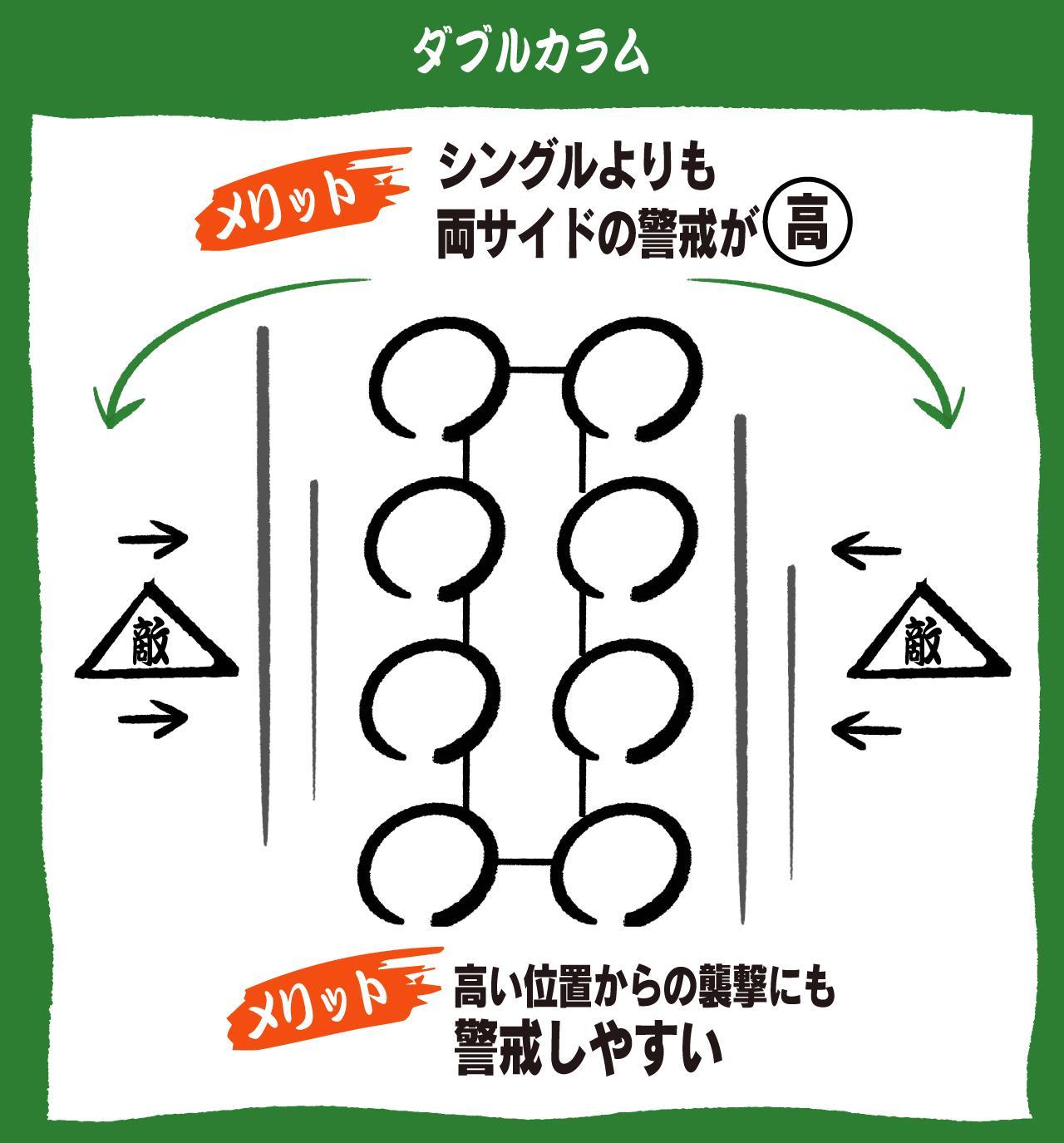 次に「ダブルカラム」という、2列に2〜5人ずつが並ぶフォーメーション。シングルカラムに次いで移動速度が速く、1列よりも周囲を警戒しやすくなります。例えば、森の真ん中の道を歩かなくてはならず、両サイドへの警戒が必要な場合。あるいは、市街地でビルなど高い位置からの敵襲が考えられる場合にも、1列より2列にして道の両サイドに配置した方が警戒しやすいです。