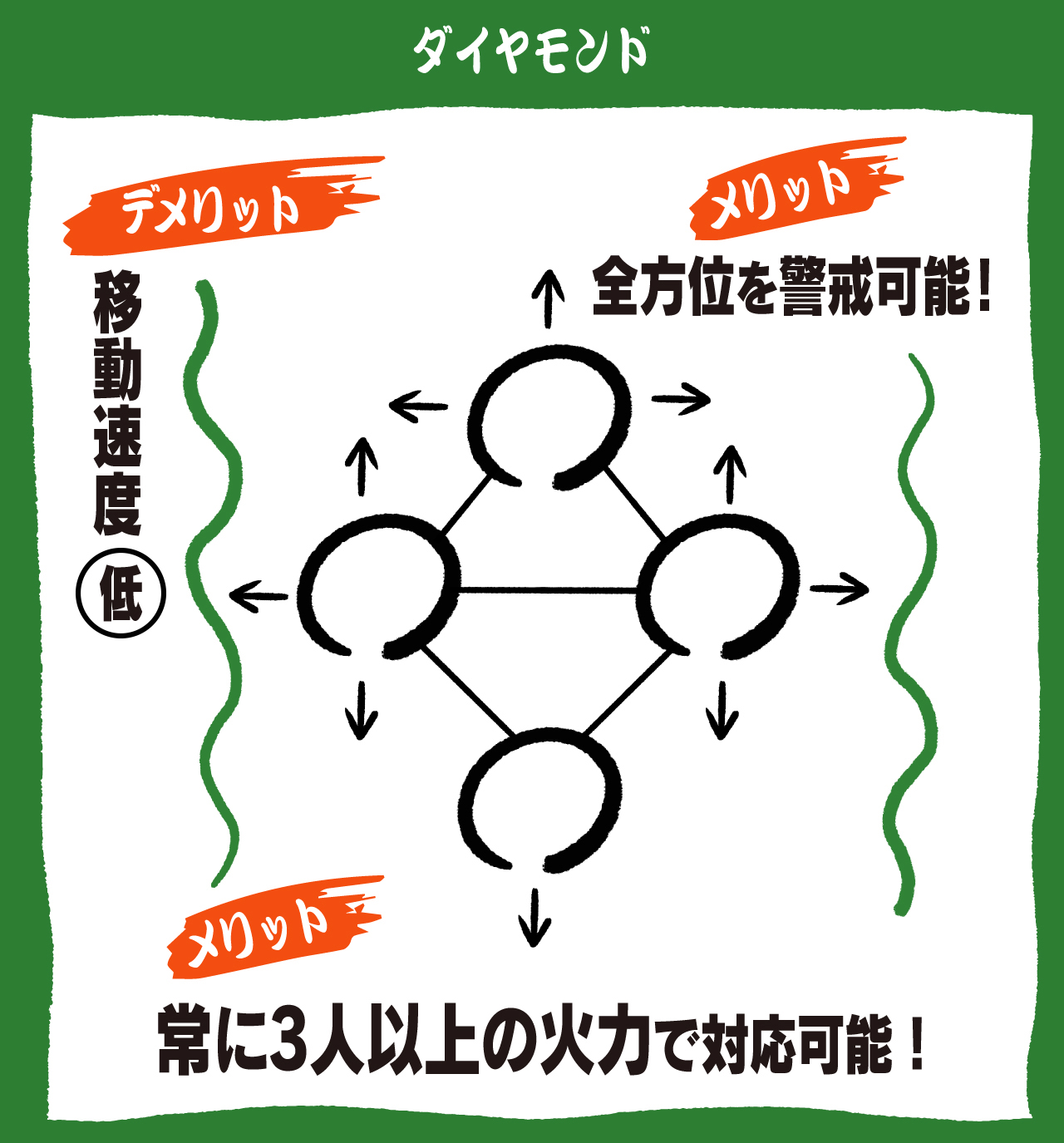 フォーマンセルでは「ダイヤモンド」という菱形のフォーメーションがあります。これは全方位を警戒しやすく、敵襲に対しても常に3人以上の火力で対応ができる。敵と遭遇しそうなエリアで警戒しながらゆっくり移動する場合に適しています。ファイブマンセルの場合はダイヤモンドの中央にリーダーを置き、そこから指揮をとることもありますね。