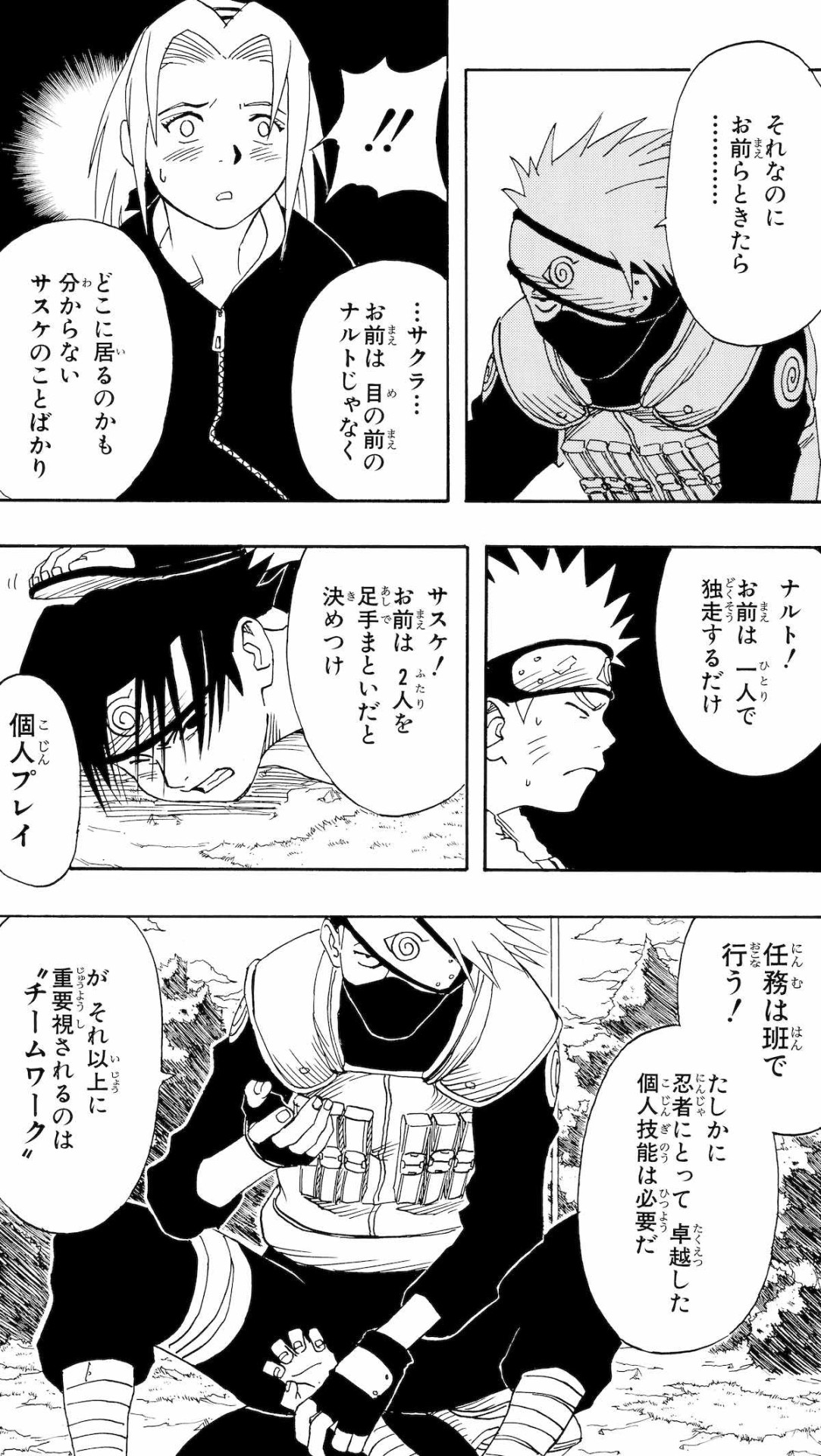 『NARUTO-ナルト-』の中で、忍たちは複数人の「チーム」を組んで任務の遂行にあたる。第七班(上忍であるカカシを上官とした、ナルト、サスケ、サクラで構成されるチーム)のように4人1組のフォーマンセルを基本とし、任務の特性や状況に合わせてスリーマンセル(3人1組)、ファイブマンセル(5人1組)などを使い分けているのだ。