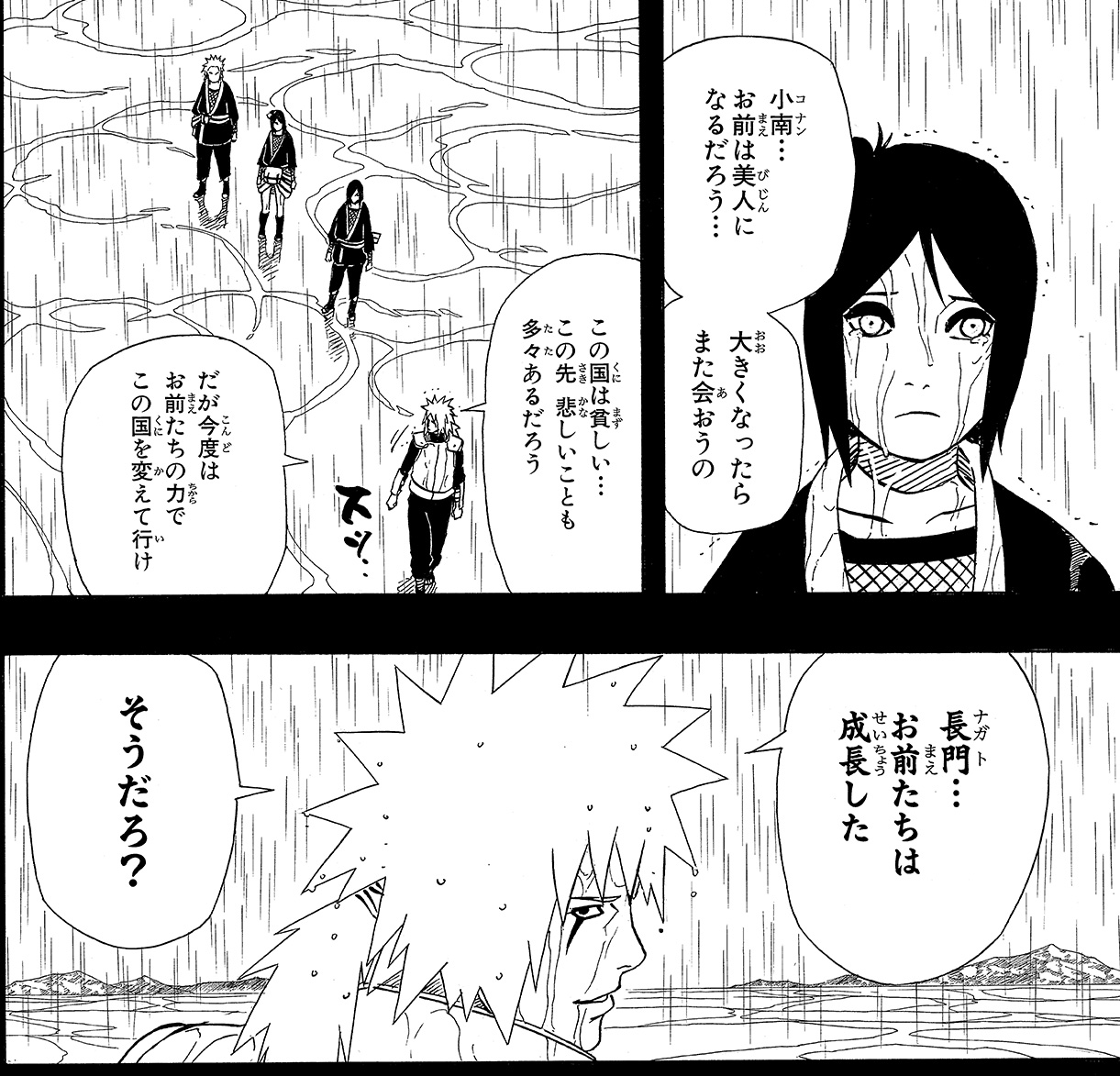 その後、自来也はナルトをカカシに託し、サスケや大蛇丸、“暁”を追い諜報活動を再開します。