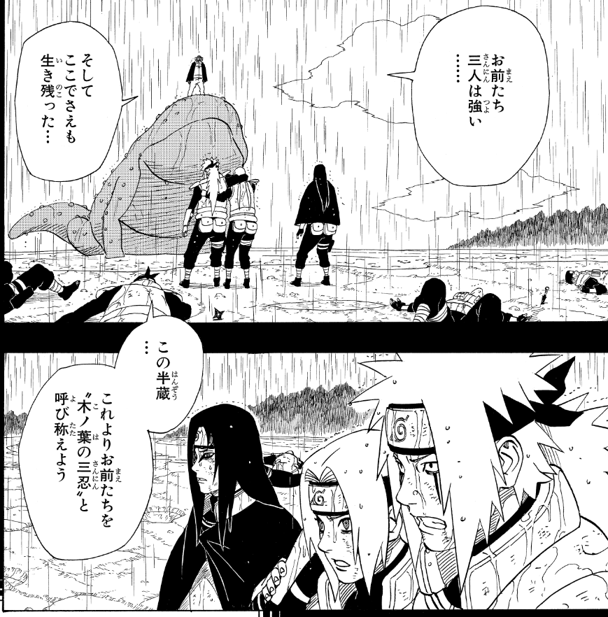 そして忍界大戦において3人は多大なる戦果をあげ、その強さを称え雨隠れの長・“山椒魚の半蔵”から“ 木ノ葉の三忍”の名を与えられました。