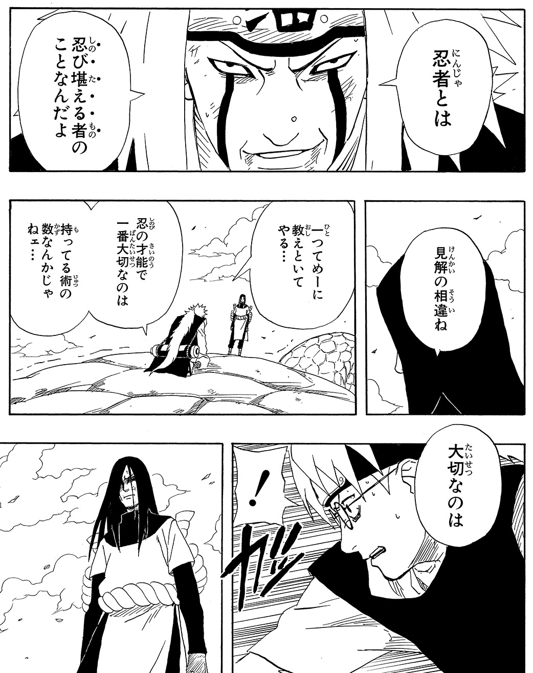 自来也はかつての友・大蛇丸を止めるため一騎打ちを挑みます。