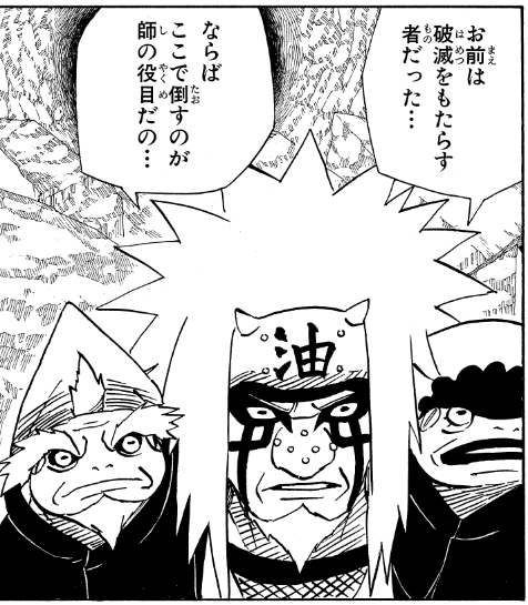 その後の修業でナルトの中の“鍵”を開かせ、九尾チャクラの引き出し方、そして“口寄せの術”を伝授しました。