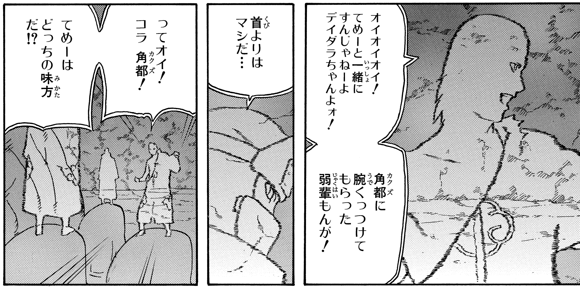 飛段は思想だけでなく、三人称「てめー」、リーダーのことを「クソリーダー」と呼ぶなど、口調も過激!