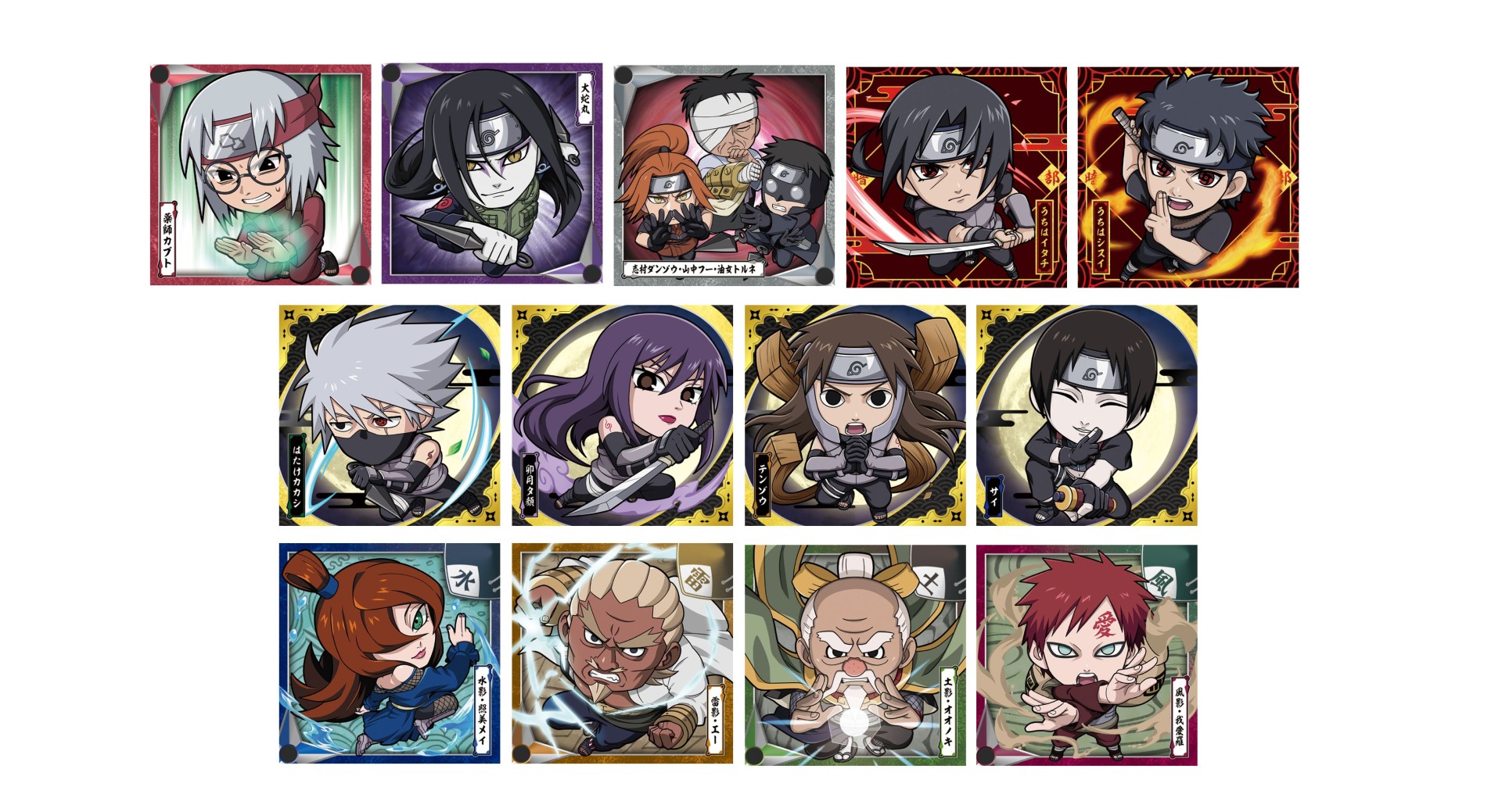 様々な忍の姿というテーマに合わせ、グッズ化の少ない服装や暗部の姿、各里の長も収録。