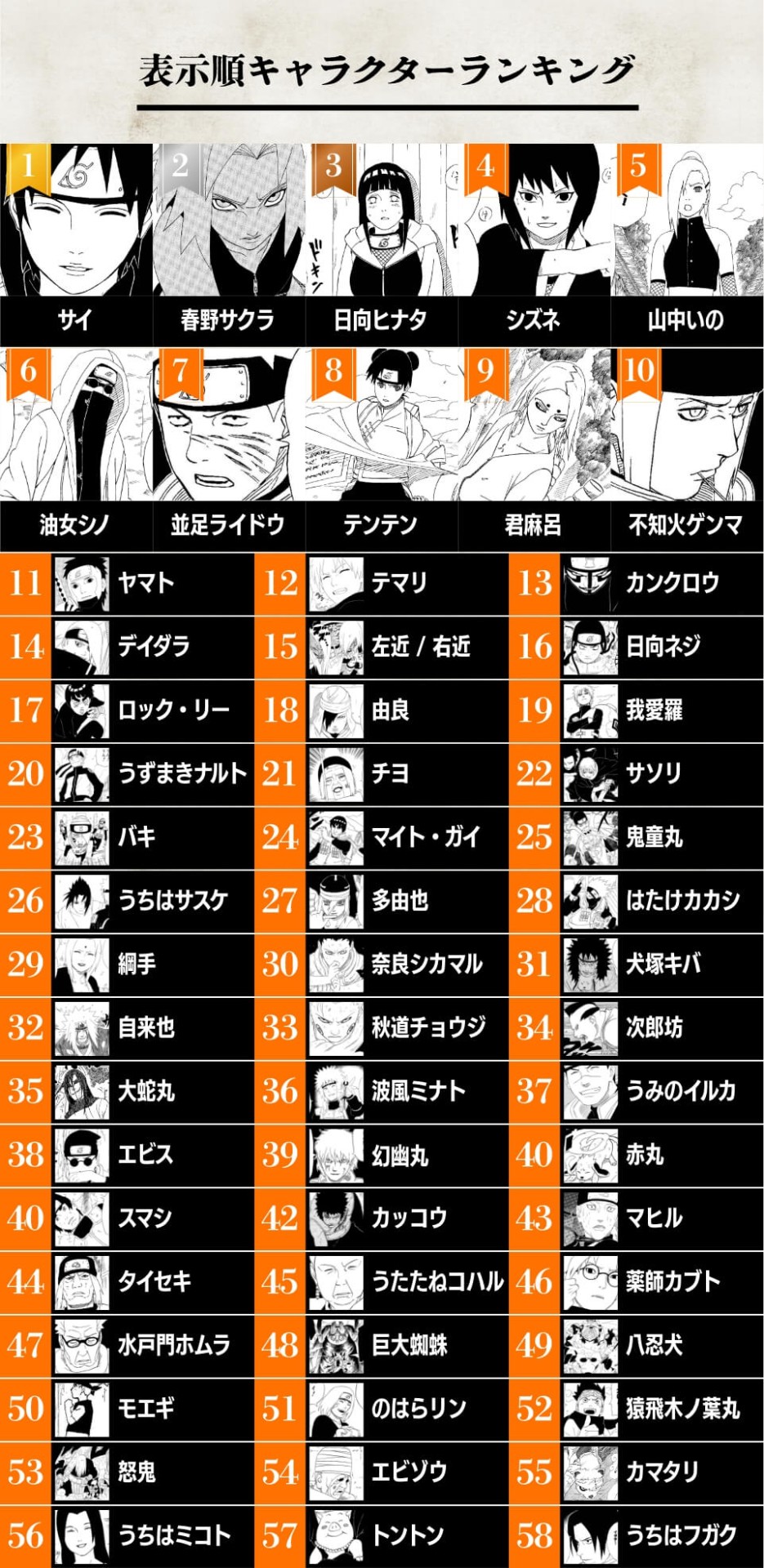 シークレットも含んだサスケ奪還編~新時代到来編リザルト全キャラクターの表示順ランキングは以下の通り。