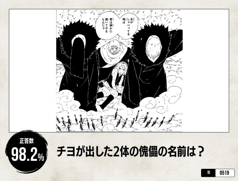 サソリとチヨバア&サクラ戦闘シーンからの出題。この傀儡はサソリが初めて造った傀儡。