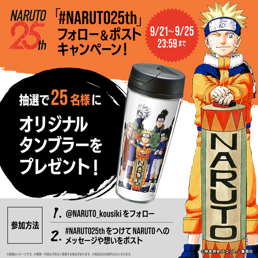 NARUTO・BORUTO【原作公式】Xアカウント(@NARUTO_Kousiki:https://x.com/NARUTO_kousiki)をフォローした上で、ハッシュタグ「#NARUTO25th」をつけて『NARUTO-ナルト-』へのメッセージや想いをポストした方に、抽選でオリジナルタンブラーを合計25名様にプレゼント!