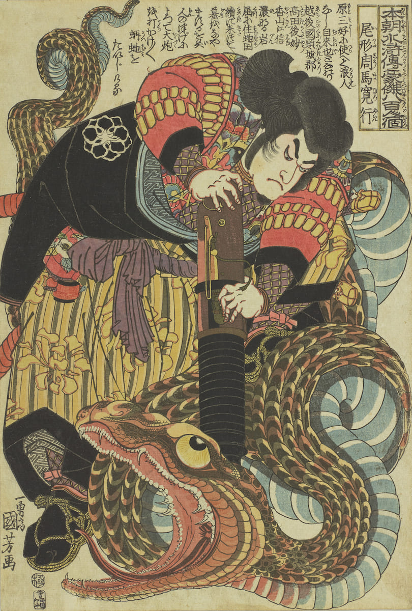 話を戻して、そんな2人の関係性を強く表現するように、合巻では、大蛇丸や敵に襲われる児雷也を綱手が助けるという設定が描かれます。綱手と児雷也が力を合わせて大蛇丸と戦う構図ですね。この辺りは、合巻の読者に女性が多かったので、女性を活躍させたのだと思います。